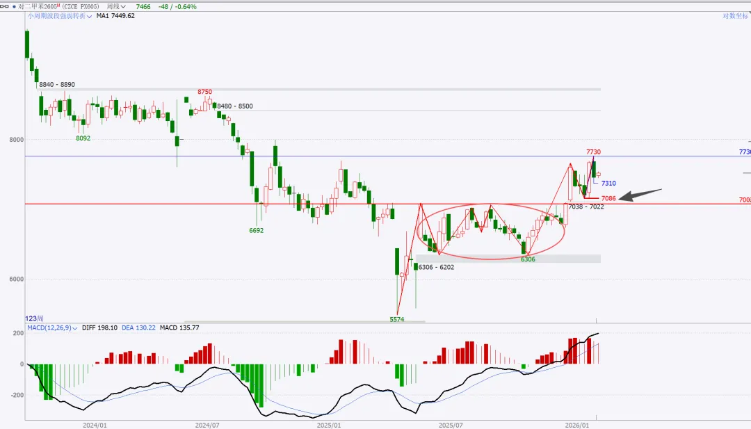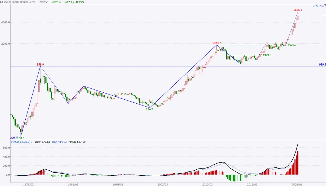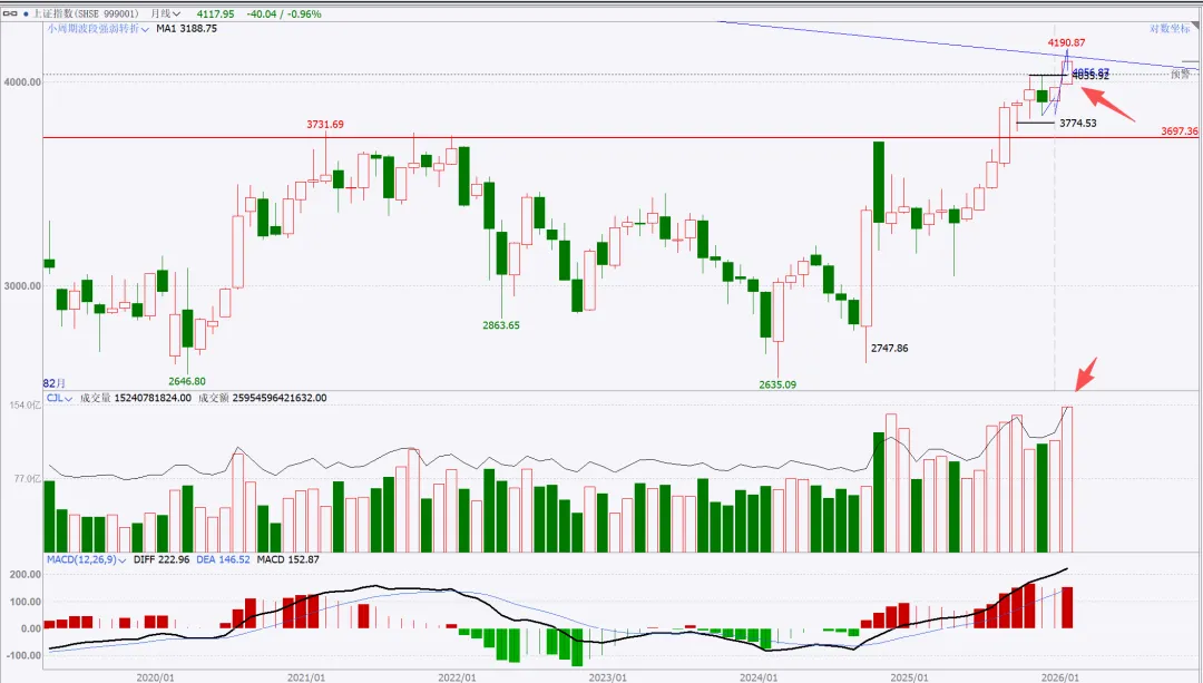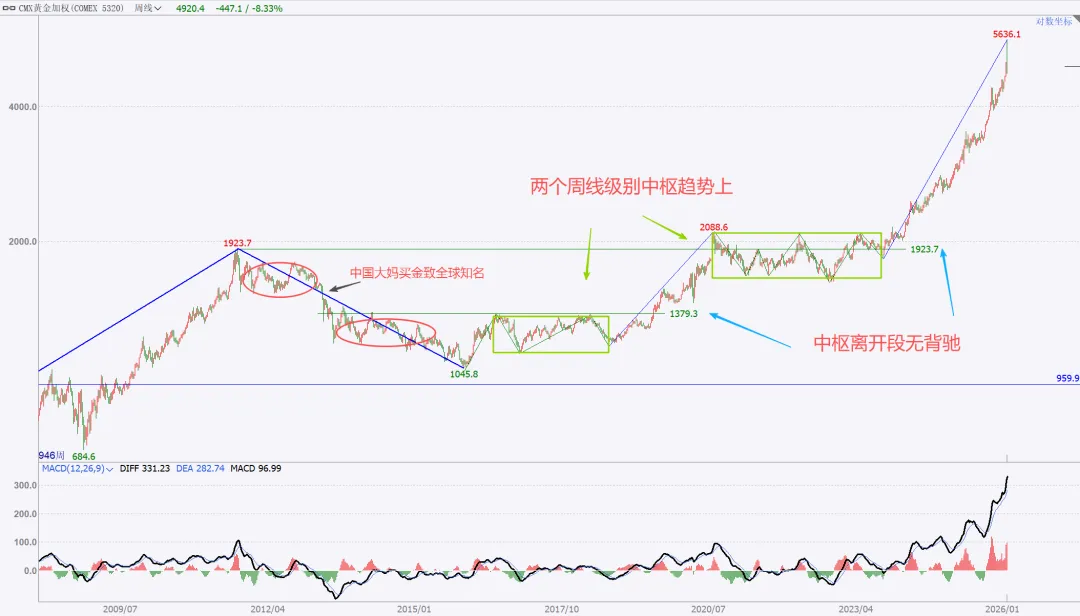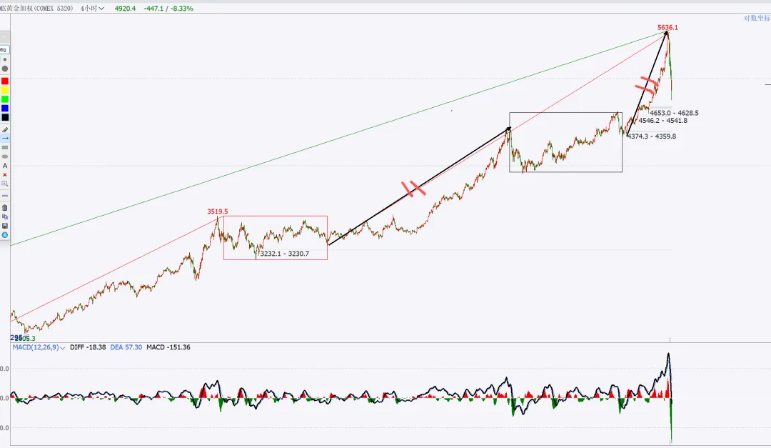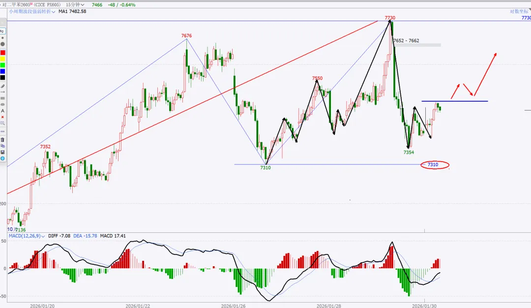 上周提示的风暴,结果出现在后半周,不过不影响,该来的始终都会来,刚好也收月线了,月度与周度复盘就二合一。没太多需要讲的,收盘站上,量价配合,月线看,向上走势延续。周五是一个低开,大幅下探回升的纺锤线,代表市场分歧,多空均衡状态。这里如果给日线底分,那么就要往上高看到4500了。如果没有底分,暂时就管住手,多看少动。15分钟转强,就一定是站上黑色箭头后回踩确认,那么真正的红包行情就开启了。总结:本周股市很乏味,没有集中的热点主题,轮动也乱七八糟不连贯。短线依然看做无序振荡。重点个股还是各自梳理结构。周五在黄金白银巨幅波动的干扰下,市场的眼球都被吸引,忽略了美股市场的走势,哪怕最强标普创高,也明显给出了短期高点的右侧确认,周五亚洲盘夜盘,伴随川子提名新任FED主席后,市场更是加速踩踏。站在大漂亮角度,川子的布局的剧本:鲍威尔继续当鹰牌,维持不降息,美元短线反弹(同时让日元缓口气),美国政府再次陷入短期停摆阶段,美股因为避险预期进入短线修正(凯文沃什根据他以外观点市场认为他是小鹰派,实用货币主义,“降息+缩表”)我持保留意见,毕竟好岳父是川子的老铁。听其言观其行,后者更重要。模型思维在任何时候都是大忌,万事万物都是生长变化的,刻舟求剑不可取,有时候“想得很美”实际上根本无法落地。我们且走且看。策略上,我还是建议不超六成,且做好防守。只要大结构不被破坏,我最保守的观点最少4500。非常清晰从图上看到,月线收盘是收在分型+验证分型的高高点之上,是有效突破。小双底是已经明确了。文华指数4小时周期图:短线调整,中线等等买点机会。本次波段拉升内部本级别走势如图所示蓝箭头部分,非常清楚,趋势上,背驰,开启拉回,在最近中枢进行走势升级的调整。耐心等等调整结束后的买入机会。PX05合约周线图:中期看多,不追涨,看好支撑回踩低多。周线看结构非常清楚,下方日线级别中枢突破后,回踩确认,大3买点。只要这个点位没被有效跌破,下方的盘整上走势就看延续。这只周五下午盘后的截图分析,就看当前这里是次级别一笔回踩,还是本级别的一笔回踩。这是周五夜盘后的截图,如果只是次级别的一笔下,7354这里就不会被跌破,而后面根据走势生长,要调整到与大级别方向一致,就一定要走出次级别再次转多的确定信号。总结:整体思路,中期在7086大买点之上维持低多观点,不追涨,短线背靠7310小止损,低多建仓。其余品种在周五都有一定幅度拉回,参考px的分析就行,记住一点,背靠大级别的买卖点进行操作,胜率更高。这是一个非常清晰的长期大多头走势结构,季线大中枢突破后,回踩完成大3买确认。2016年开启本轮上升,两个周线级别中枢,形成趋势上行走势,如图标注无背驰。蓝箭头开启本轮往上走势,按照级别划分,再次走出两个同级别中枢,形成30分钟级别趋势往上走势,且无背驰。聚焦30分钟级别离开段内部,可以看到黑色中枢进入段与离开段形成了盘背。那么这个拉回就是针对这个背驰开启的快速修正。每一段蓝色线都是代表一个1分钟级别走势,1分钟级别走势之间也是没有背驰的,因此当前的拉回,针对的就是上图黑色部分即5分钟级别盘背一个快速修正。如果4596.2没有被刺破,就是一个中枢3买;刺破,则看做中枢扩展。从当前技术面分析,我是看不出来黄金任何转空信号,站在周线角度看,两条路径做不测而测:要么就是开启周线横盘震荡整理,做第三个中枢,持续时间较长,以年为单位,前两个都分别走了两年;或者是接下来慢慢修复短线的急杀,收复这根周线纺锤线,接着再创高点,形成大级别背驰后,见到真正的阶段性高点。在极强的牛市走势里,缓涨急跌是多见的,而我个人也更倾向后者。投资视角的建议,不追涨,哪怕是实物现货也不在当前的位置进行买入操作。非实物的话,更不建议碰。做个旁观者,进行跟踪观察分析足够了。以上就是本次的复盘内容,仅代表个人立场与观点,不具备任何投资依据。理查德丹尼斯