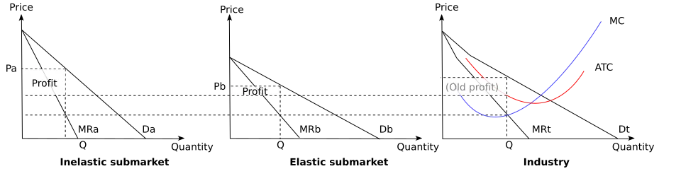 (1)价格歧视(差别定价)指对同一商品/服务向不同消费者收取不同价格,以获取更多剩余。常见分为一级、二级、三级等类型。(2)核心不是“分得更细”,而是“价格围栏(price fences)”设计:用规则把不同支付意愿的人群自然分开,降低套利与抱怨。常见围栏:• 身份围栏:学生/企业/政府、会员等级、区域与渠道图6:三级价格歧视示意——拆分市场后分别定价,利润结构会改变。3.3 两部制定价:把“消费频次”变成稳定现金流