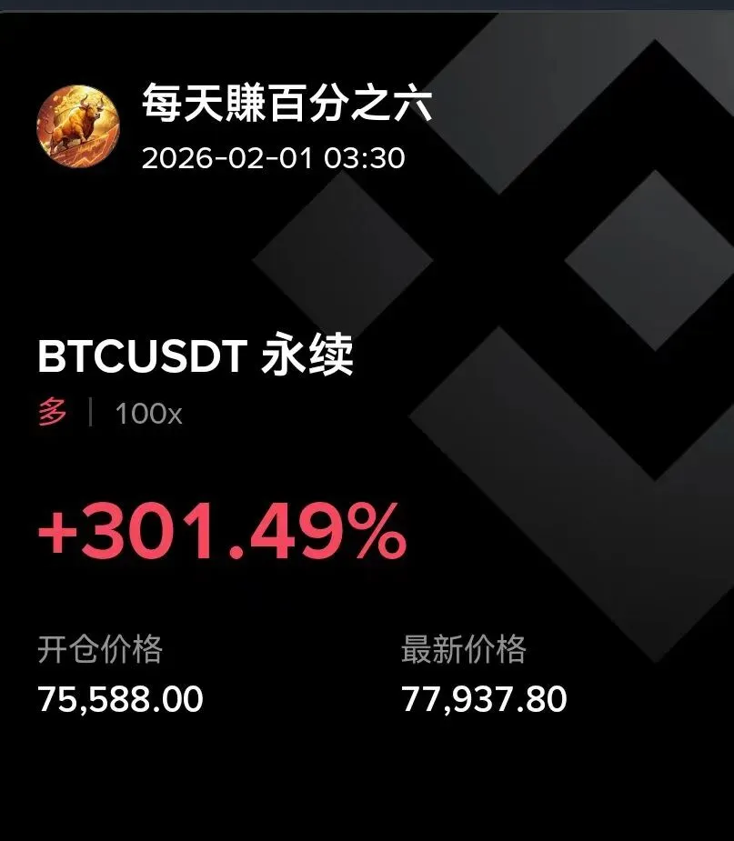 现在是02月01日凌晨03:38分,刚刚原本在公*众号写行情分析的我发现BTC价格突然暴跌,只好把写了一半的个人思路发了出来。这里先吹个牛逼,这个牛逼必须得吹,赚钱不晒单如同锦衣夜行:空下去,多上来!短短两个小时,BTC空单和多单拿到了8000点的收益,更重要的是,这里我接到了埋伏两个月的多单-75588(图三,中间由于仓位调整,中间几次取消后当即挂回),在这个位置我再次平掉25%的空单(第一次减仓78588),目前空单还有25%仓位,多单的话我也在77888减仓了50%,刚才广场晒单,有朋友说我减仓的太早,可能我们交易系统不同,我认为几分钟拿到两千多点完全可以走掉一部分,这个时间效率对我来说已经很高了,当然我很赞同他的点位,只不过他是做长线,而我大部分是日内单。牛逼继续:这个75588的埋伏多单我在前日的行情分析中提过一次,不知道有没有只看文章的朋友跟上,这一单的牛逼之处在于目前为止BTC的最低价格打到75500后就开始有了近3000点的反弹,比上次提前一个多月埋伏的98888价格只到了98888.8(25年11月4日)的多单要值得庆贺,毕竟吃到了。行情方面,BTC也是在前几日的持续下跌后,昨日再次下跌了9000点,最低价格75500(哈哈哈~),目前反弹至77800附近开始震荡,相较于前几次的下跌反弹,这次的交易量没有明显增加,也存在周末休息的原因,只有周一再次触摸这里后的市场行情变化才能推断这里是否是一个强力的支撑位。所以周末我们的做单计划相对保守止损位置也会比以往要大一些,接近75500做多,止损放在74000,空单在80500附近入场,止损81388,这两个位置被打损的情况下,可以在破位后大胆去追,止损1000以内,对于行情走势我们不能依照自己的想法去头铁和他对抗,要像陪酒小妹一样,去顺着他,按照他的方向我们才能赚钱,做错了就罚杯酒呗。今日周末,激进单不再推荐,风险太高,守住本金你才能继续赚钱。再次说下ETH,关注我的有ETH的点位分享,但是没有策略。就像刚刚,ETH一分钟插针2202后反弹了150多点,即使五倍的仓位止损30点,那几秒钟可能五六十点的滑点你都承受不了,账户瞬间缩水30%,点位高点的话直接爆仓。2026.02.01BTC开单建议:上方80500追空单目前持有25%仓位,止损81388,上去打算补仓,87888-85588止盈。