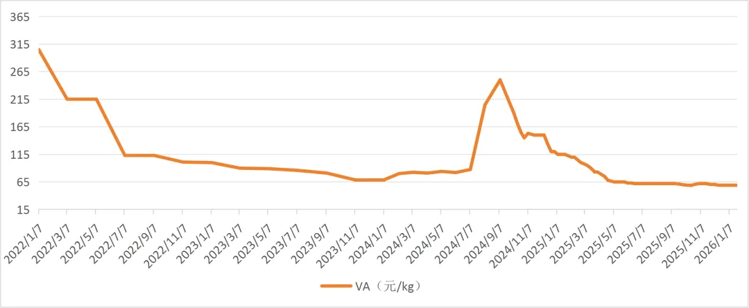 蛋氨酸的价格最近弱势下行,价格处于低位探底震荡,下游养殖业的盈利情况会影响对高端饲料添加剂的投入意愿,使得蛋氨酸需求呈现出一定的周期性。
