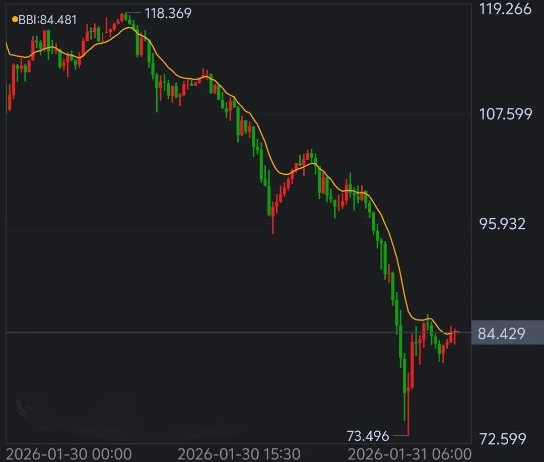 伦敦银现报84.429美元/盎司,日内暴跌约40美元,跌幅达22%,盘中最低触及73.496美元/盎司,最大跌幅超36%。COMEX白银期货报价85.25美元/盎司,跌幅超25%,市场恐慌情绪蔓延。