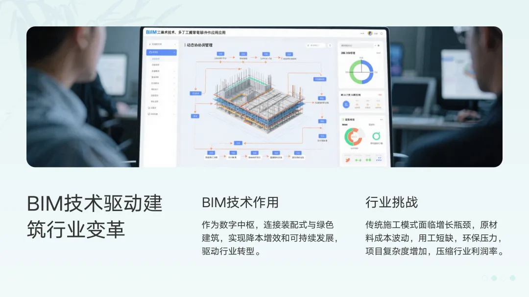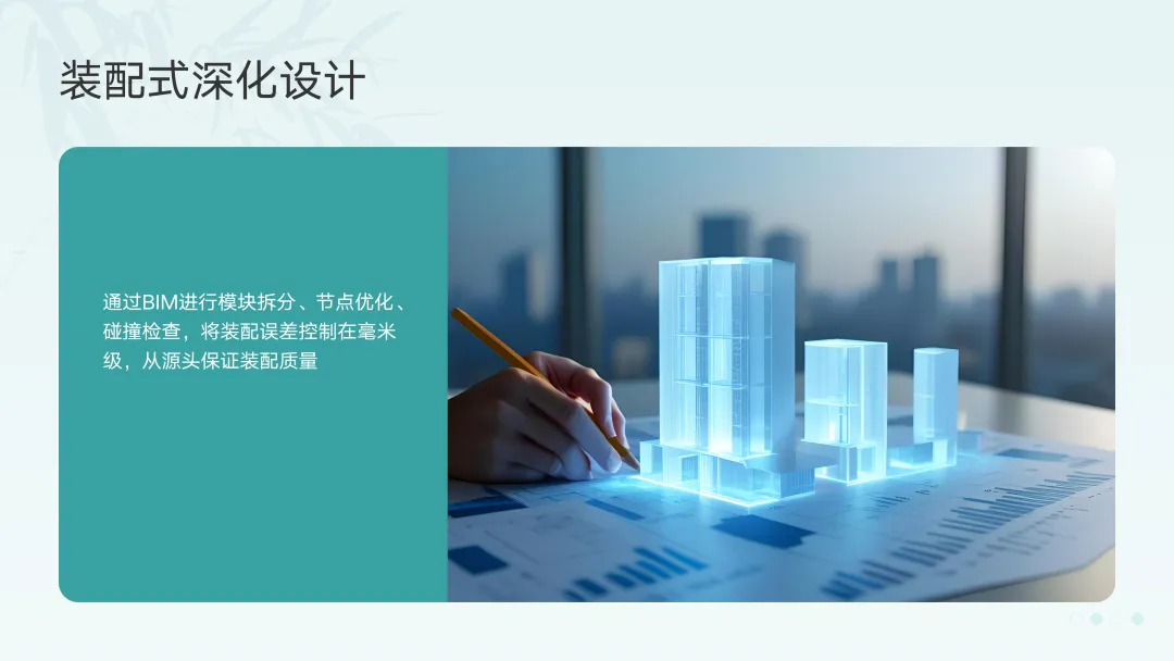 装配式与绿色建筑都对项目的精细化、协同化、数据化提出了前所未有的高要求。这正是BIM(建筑信息模型)技术的用武之地。行业洞察:BIM技术已从"三维可视化"工具,进化为贯穿建筑全生命周期的"数据中台"。它让装配式的"精准对接"和绿色建筑的"性能模拟"成为可能。- 装配式深化设计:通过BIM进行模块拆分、节点优化、碰撞检查,将装配误差控制在毫米级,从源头保证装配质量。