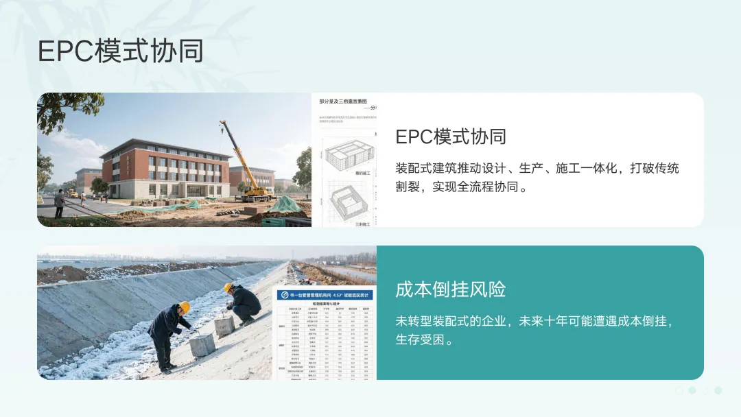 - EPC模式协同:装配式建筑倒逼设计、生产、施工一体化(EPC),打破了传统设计、施工、装饰分离的割裂状态。