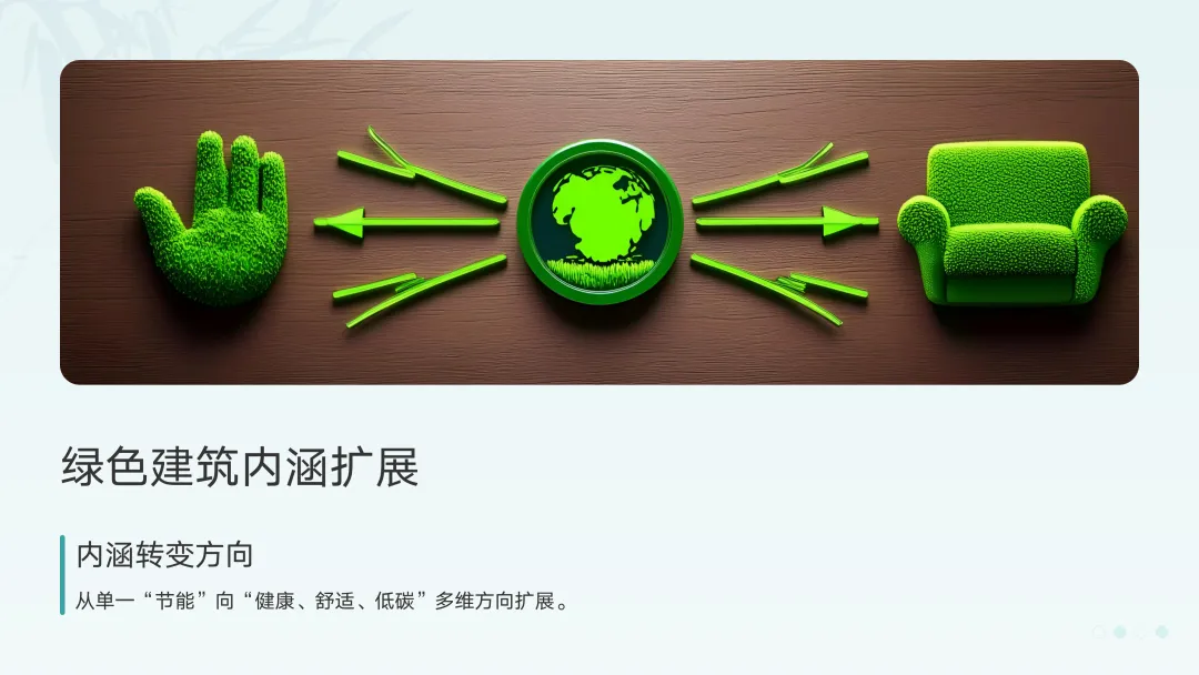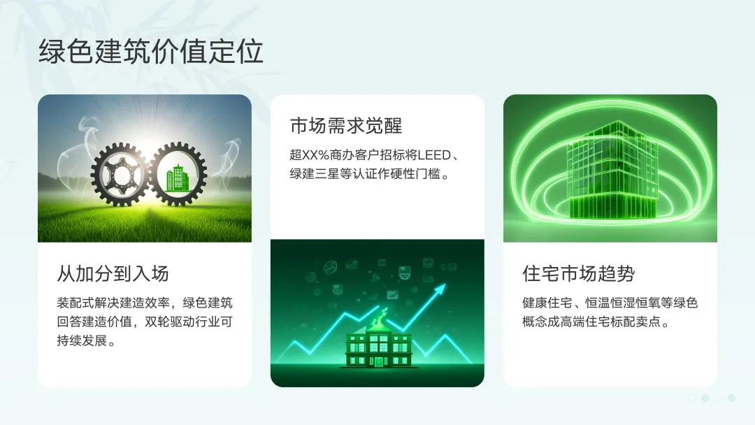 如果说装配式解决的是"如何建造"的效率问题,绿色建筑则回答"为什么建造"的价值问题。两者相辅相成,共同构成行业可持续发展的双轮驱动。市场需求觉醒:根据市场调研数据,超过XX%的商办客户在招标时将绿色建筑认证(如LEED、绿建三星)作为硬性门槛。在住宅市场,"健康住宅"、"恒温恒湿恒氧"等绿色概念已成为高端项目的标配卖点。绿色建筑的内涵正在从单一的"节能"向多维的"健康、舒适、低碳"扩展:- 材料革命:低碳建材、可循环材料、健康建材(低VOC、无甲醛)的应用比例快速提升。传统高污染、高能耗材料正被加速淘汰。