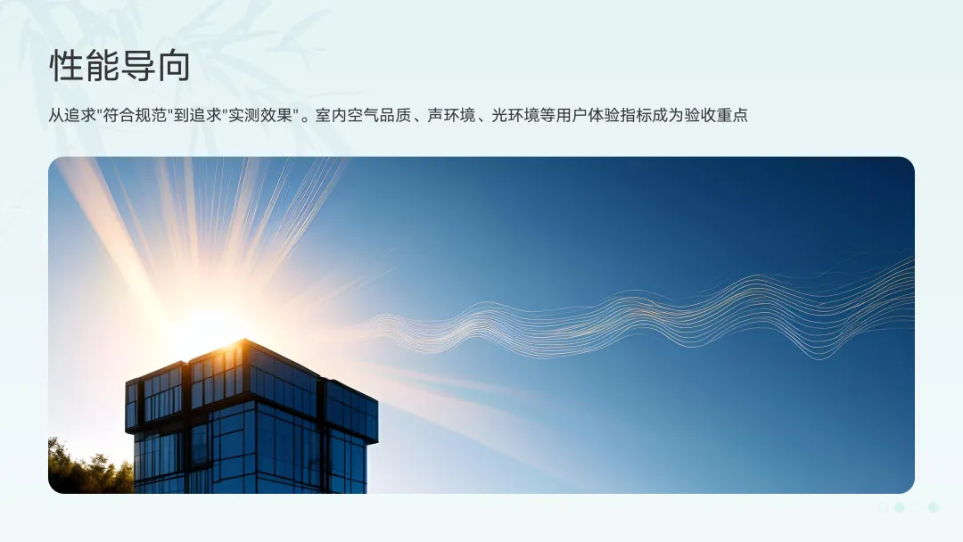 - 性能导向:从追求"符合规范"到追求"实测效果"。室内空气品质、声环境、光环境等用户体验指标成为验收重点。