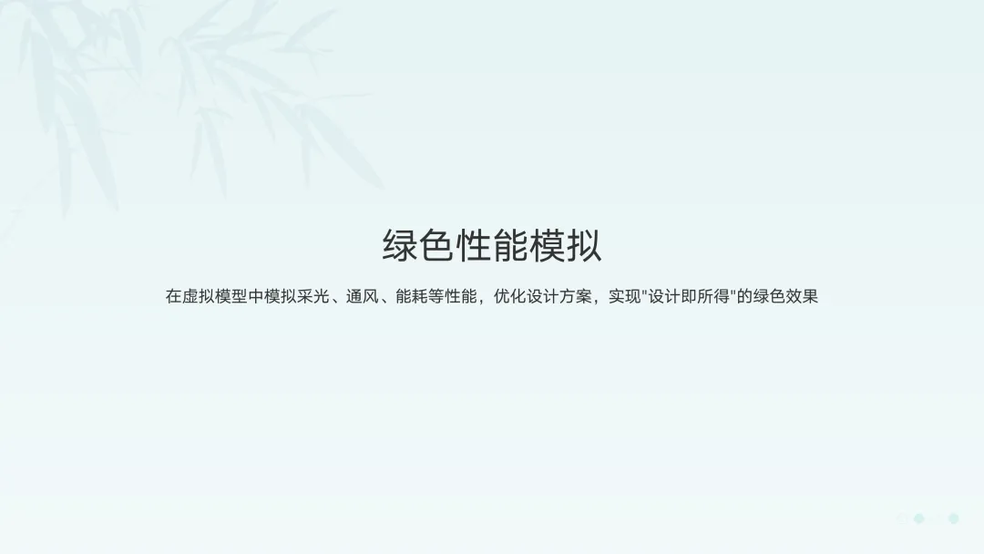 - 绿色性能模拟:在虚拟模型中模拟采光、通风、能耗等性能,优化设计方案,实现"设计即所得"的绿色效果。