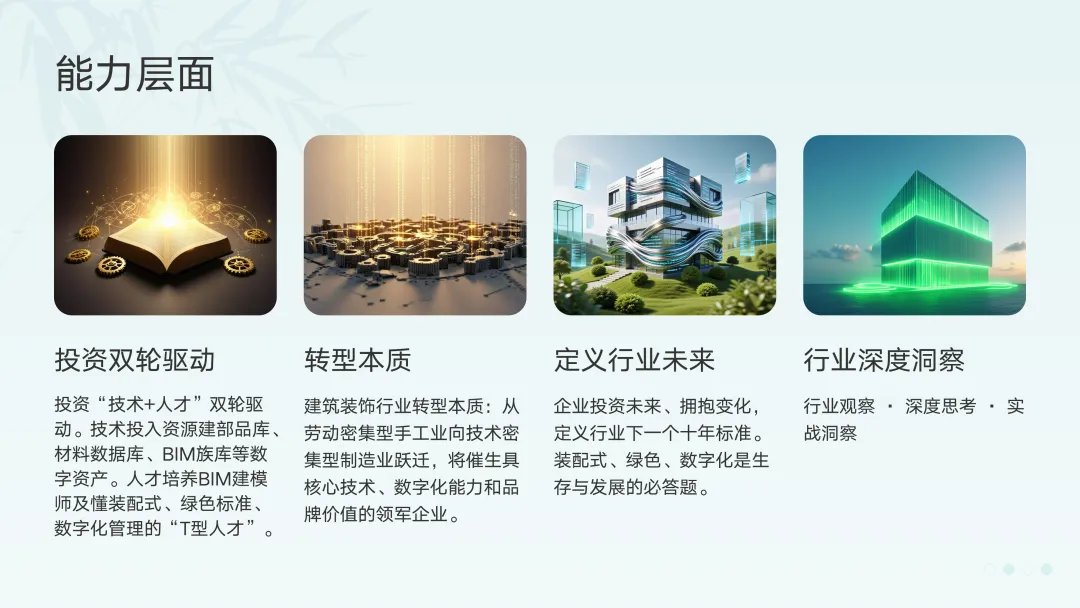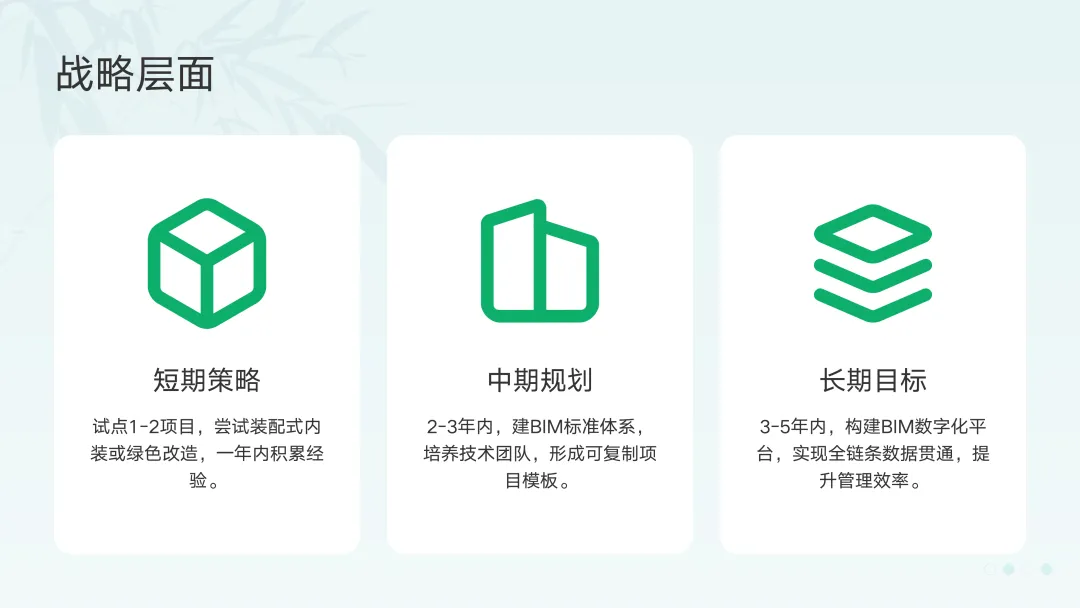 面对装配式与绿色建筑的双重趋势,企业不应观望,而应主动拥抱。基于行业最佳实践,我提出三条具体建议:1. 战略层面:制定"三步走"转型路线图• 短期(1年内):选择1-2个试点项目,尝试装配式内装或绿色改造,积累经验。• 中期(2-3年):建立企业级BIM标准体系,培养复合型技术团队,形成可复制的装配式/绿色项目模版。• 长期(3-5年):构建基于BIM的数字化管理平台,实现设计、采购、生产、施工、运维全链条数据贯通。2. 组织层面:打破部门墙,建立协同工作模式装配式和绿色建筑都是系统工程。企业需要打破传统设计、施工、采购各自为政的格局,组建跨职能的"产品化项目部",让设计师懂工艺、让施工员懂设计、让采购员懂性能。3. 能力层面:投资"技术+人才"双轮驱动• 技术:投入资源建立企业级部品库、材料数据库、BIM族库等数字资产。• 人才:不仅培养BIM建模师,更要培养懂装配式、懂绿色标准、懂数字化管理的"T型人才"。写在最后:建筑装饰行业的这次转型,本质上是从"劳动密集型手工业"向"技术密集型制造业"的跃迁。这个过程必然伴随阵痛,但也将催生一批具有核心技术、数字化能力和品牌价值的新时代领军企业。那些在今天敢于投资未来、拥抱变化的企业,不仅是在应对市场挑战,更是在定义行业的下一个十年标准。装配式、绿色、数字化——这不再是一道选择题,而是一道关乎生存与发展的必答题。