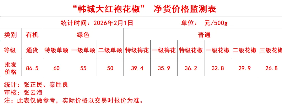>“韩城大红袍花椒”2026年度净货价格监测表(第二期)