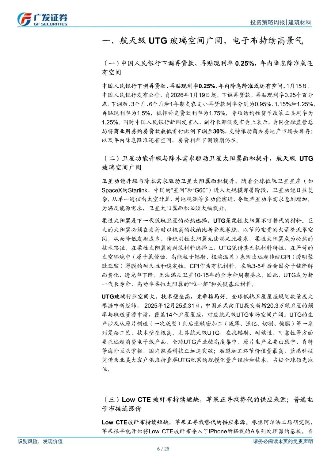 航天级 UTG 玻璃空间广阔,电子布持续高景气。1 月 15 日,中国人民银行发布公告,自 2026 年 1 月 19 日起,下调再贷款、再贴现利率0.25 个百分点。同时将商业用房购房贷款最低首付比例下调至 30%,年内降息降准还有空间,房贷利率下调预期仍在。卫星功能升级与降本需求驱动卫星太阳翼面积提升,柔性太阳翼是下一代低轨卫星的必然选择,UTG 是柔性太阳翼不可替代的材料。