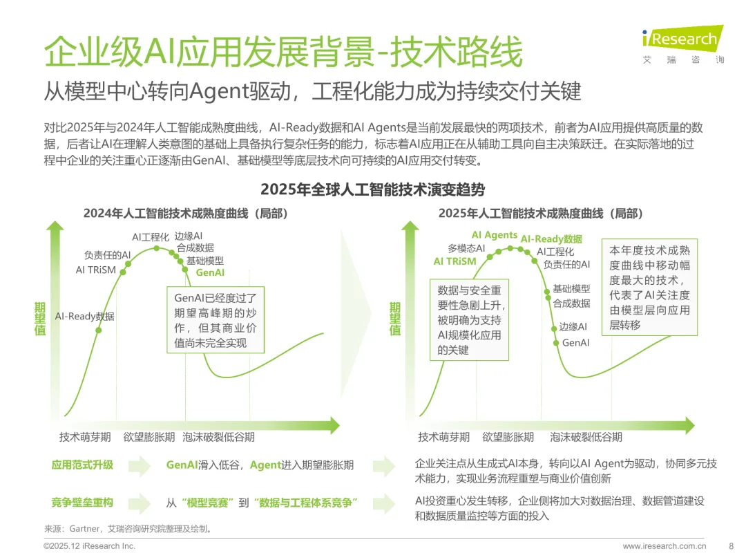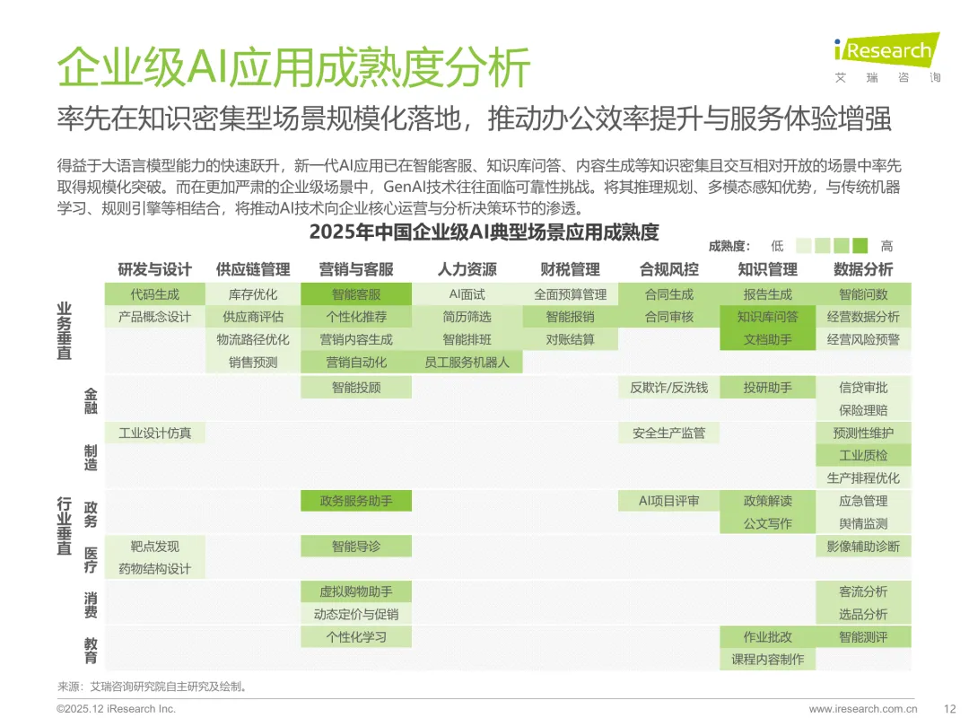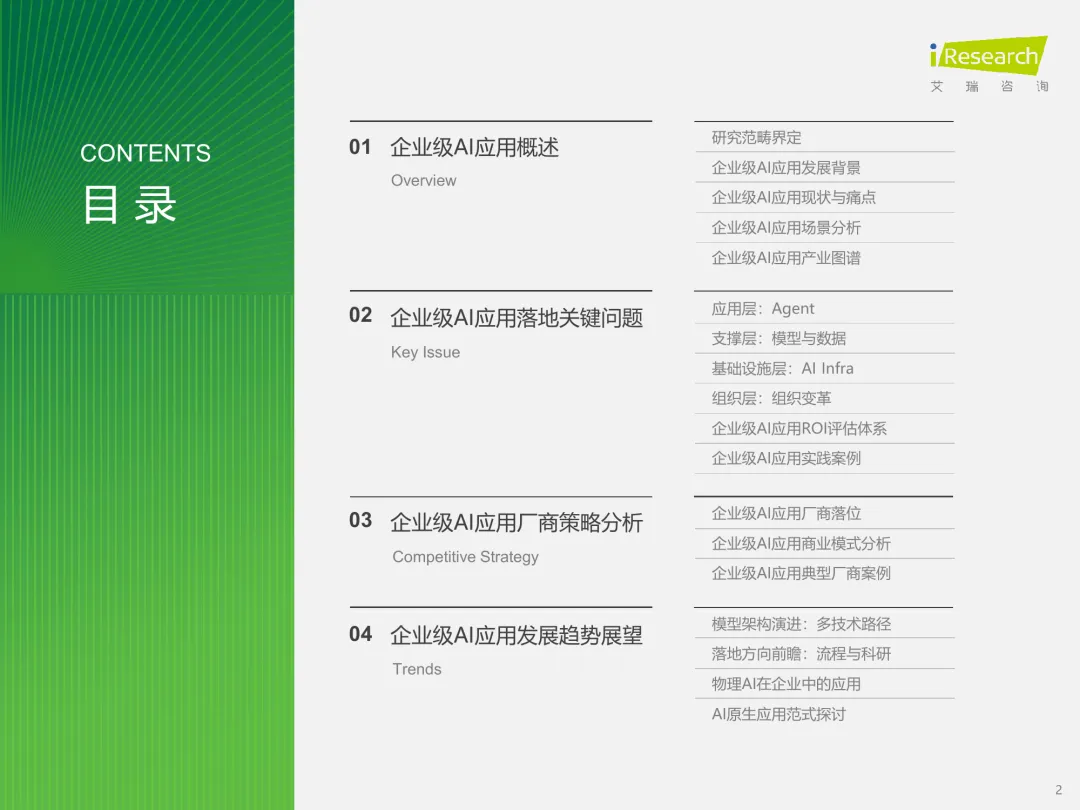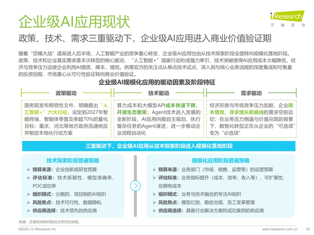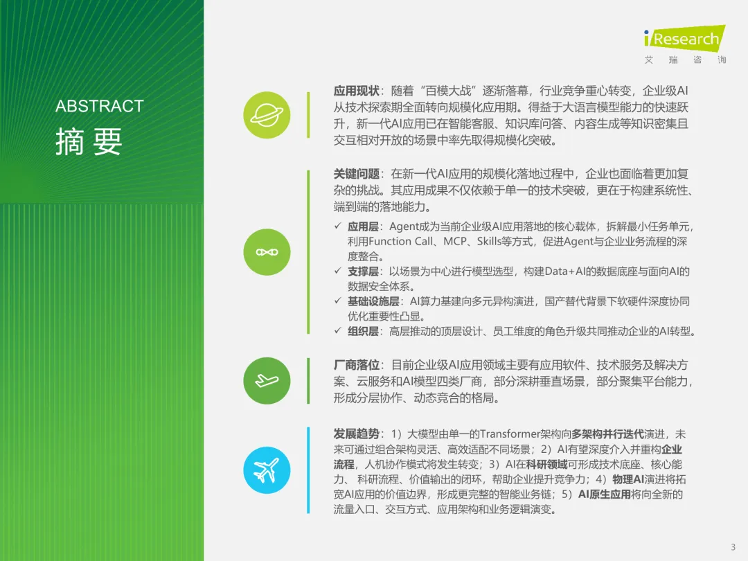 企业级AI应用正从技术探索阶段全面进入规模化落地阶段。随着大语言模型能力的显著提升,AI在智能客服、知识库问答、内容生成等知识密集且交互开放的场景中已实现初步突破。企业对AI的需求已从单纯的技术验证转向实际业务价值的创造。企业在推进AI应用过程中面临多维度挑战,需构建系统性、端到端的落地能力。在应用层,Agent成为核心载体,通过拆解任务、调用功能模块等方式与业务流程深度结合。支撑层强调以场景为导向进行模型选型,建立数据底座和数据安全体系。基础设施层呈现多元异构趋势,国产替代背景下软硬件协同优化愈发重要。组织层面则需要高层推动的顶层设计与员工角色的重新定位,共同支撑AI转型。当前企业级AI应用厂商主要分为四类:应用软件、技术服务及解决方案、云服务和AI模型。各厂商在垂直领域或平台能力上各有侧重,形成分层协作、动态竞合的格局。未来发展趋势显示,大模型将向多架构并行演进,提升适配不同场景的能力;AI将深度介入企业流程,重塑人机协作模式;科研领域将形成技术底座、能力输出、流程优化和价值转化的闭环;物理AI的发展将拓展应用场景边界,构建更完整的智能业务链;AI原生应用将带来全新的流量入口、交互方式、架构逻辑和业务模式。