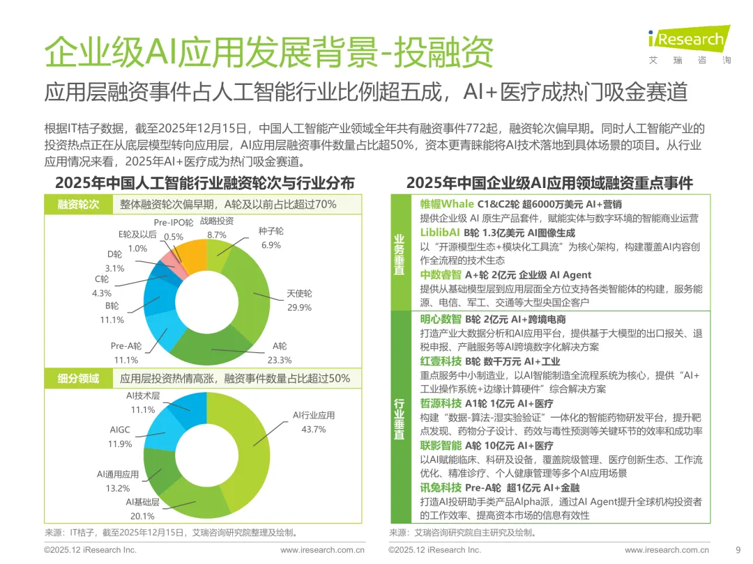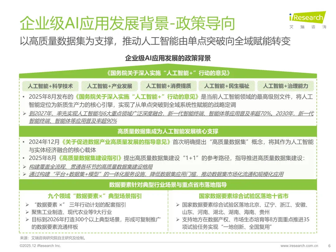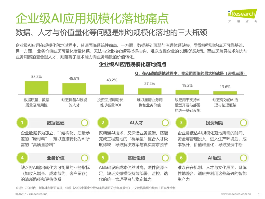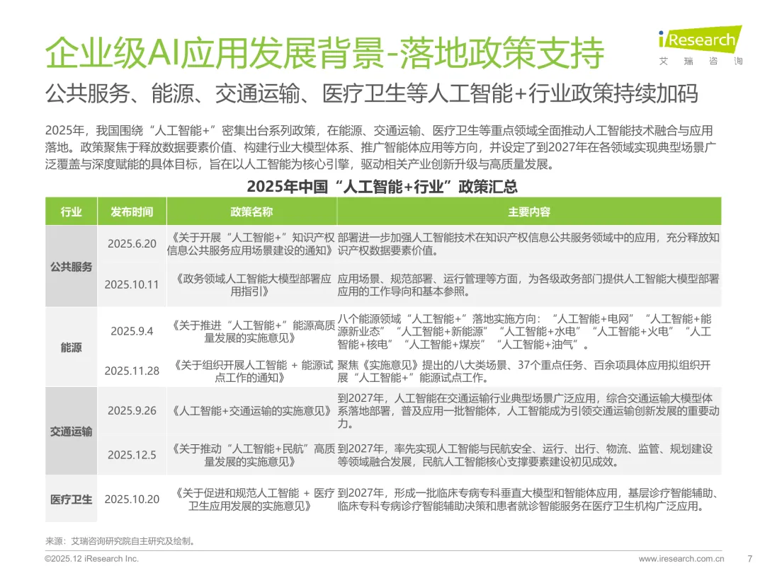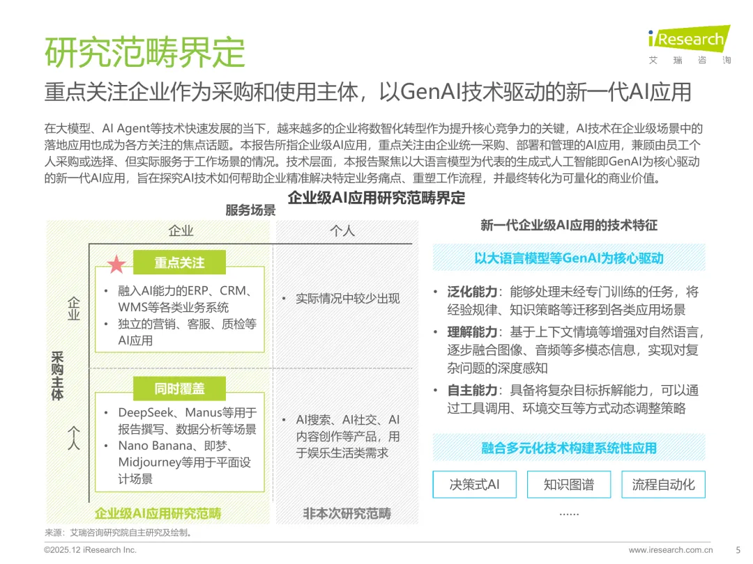 企业级AI应用正从技术探索阶段全面进入规模化落地阶段。随着大语言模型能力的显著提升,AI在智能客服、知识库问答、内容生成等知识密集且交互开放的场景中已实现初步突破。企业对AI的需求已从单纯的技术验证转向实际业务价值的创造。企业在推进AI应用过程中面临多维度挑战,需构建系统性、端到端的落地能力。在应用层,Agent成为核心载体,通过拆解任务、调用功能模块等方式与业务流程深度结合。支撑层强调以场景为导向进行模型选型,建立数据底座和数据安全体系。基础设施层呈现多元异构趋势,国产替代背景下软硬件协同优化愈发重要。组织层面则需要高层推动的顶层设计与员工角色的重新定位,共同支撑AI转型。当前企业级AI应用厂商主要分为四类:应用软件、技术服务及解决方案、云服务和AI模型。各厂商在垂直领域或平台能力上各有侧重,形成分层协作、动态竞合的格局。未来发展趋势显示,大模型将向多架构并行演进,提升适配不同场景的能力;AI将深度介入企业流程,重塑人机协作模式;科研领域将形成技术底座、能力输出、流程优化和价值转化的闭环;物理AI的发展将拓展应用场景边界,构建更完整的智能业务链;AI原生应用将带来全新的流量入口、交互方式、架构逻辑和业务模式。