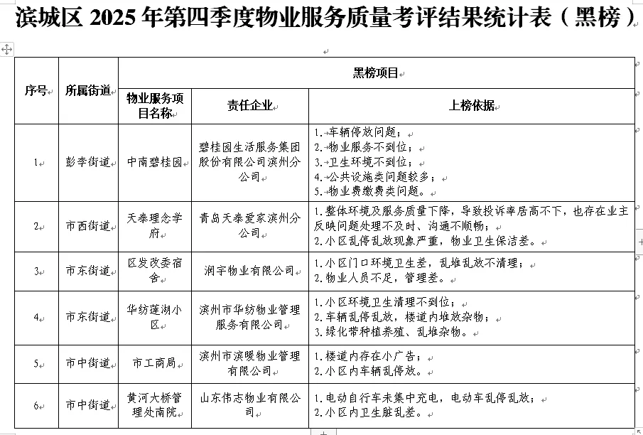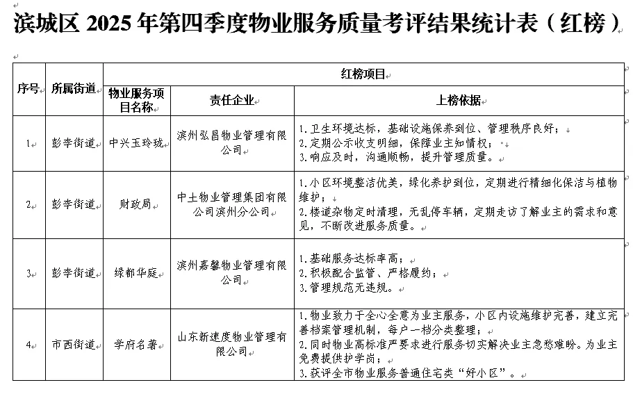 滨城区2025年第四季度物业行业“红黑榜”情况通报为进一步规范物业服务企业服务行为,提高物业服务水平和群众满意度,区住建局聚焦城市品质提升,依托《滨州市住宅小区物业服务质量监督考核评价管理办法》开展了物业服务质量考评工作,共评选出红榜企业10家、黑榜企业6家,现将滨城区2025年第四季度物业行业“红黑榜”相关情况通报如下: