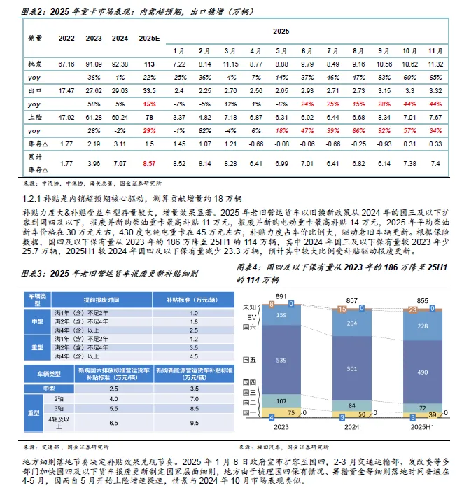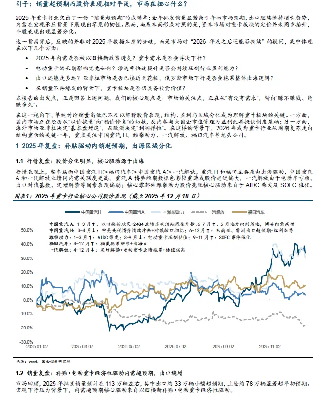 2025年重卡行业销量超预期而资本市场对板块的定价并未同步抬升,这一背离背后,反映的并非对 2025 年数据本身的分歧,而是市场对 “2026 年及之后还能否持续 的疑问,集中体现在以下几个方面: 1 、 2025 年内需是否被以旧换新政策透支? 2 、 电动重卡的长期影响究竟如何? 3 、 出口还能走多远? 4 、 在销量 可能 不再爆发的背景下,重卡板块是否仍具备投资价值? 本报告的出发点正是回答上述问题。