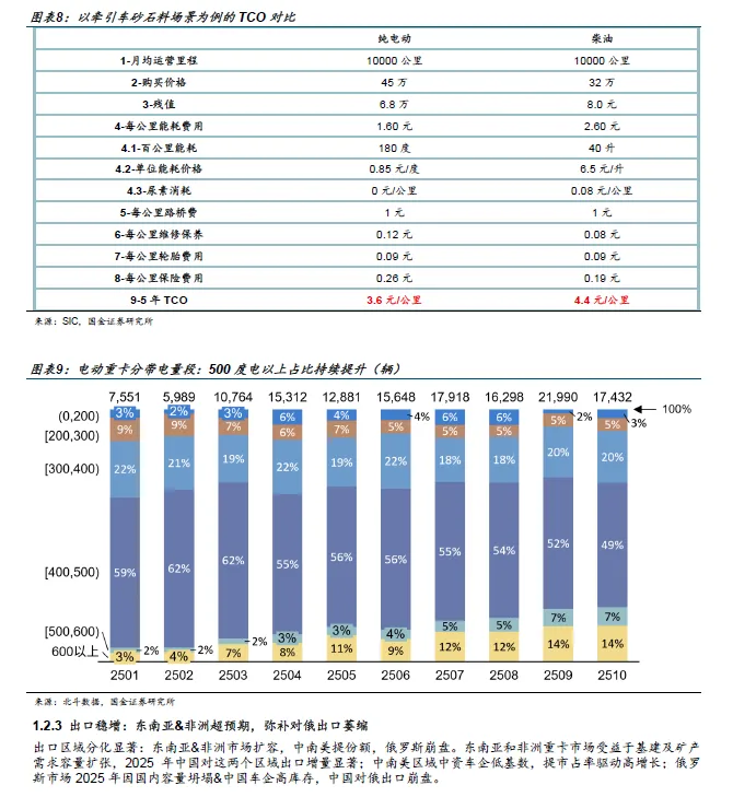 2025年重卡核心标的 股价表现分化明显,核心解释源于出海差异。销量超预期核心 受 内销补贴驱动,测算 补贴 贡献增量约 18 万辆,其次是电动重卡 TCO 经济性驱动车队油转电 or 增购电车;出口端区域分化显著:东南亚 非洲市场扩容,中南美提份额,俄罗斯崩盘。
