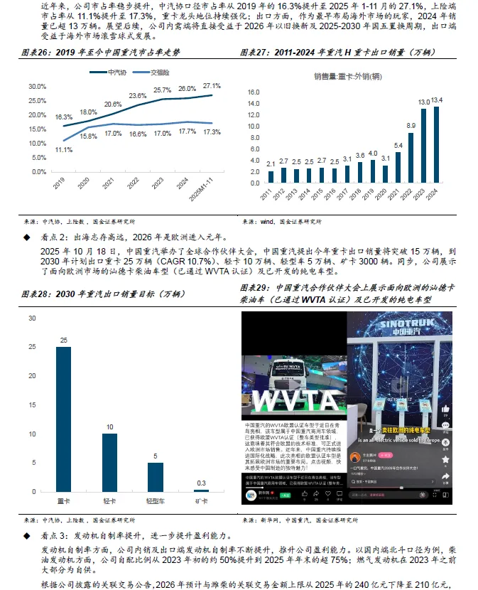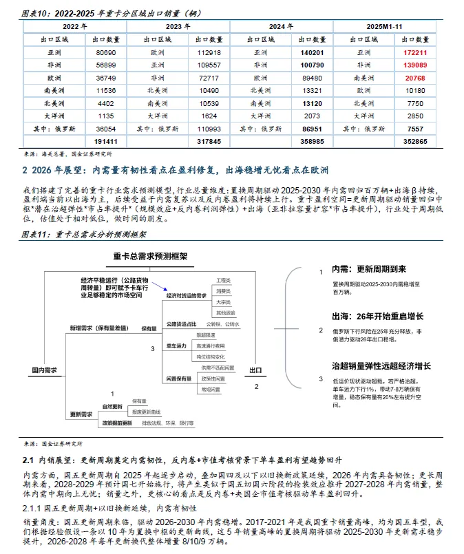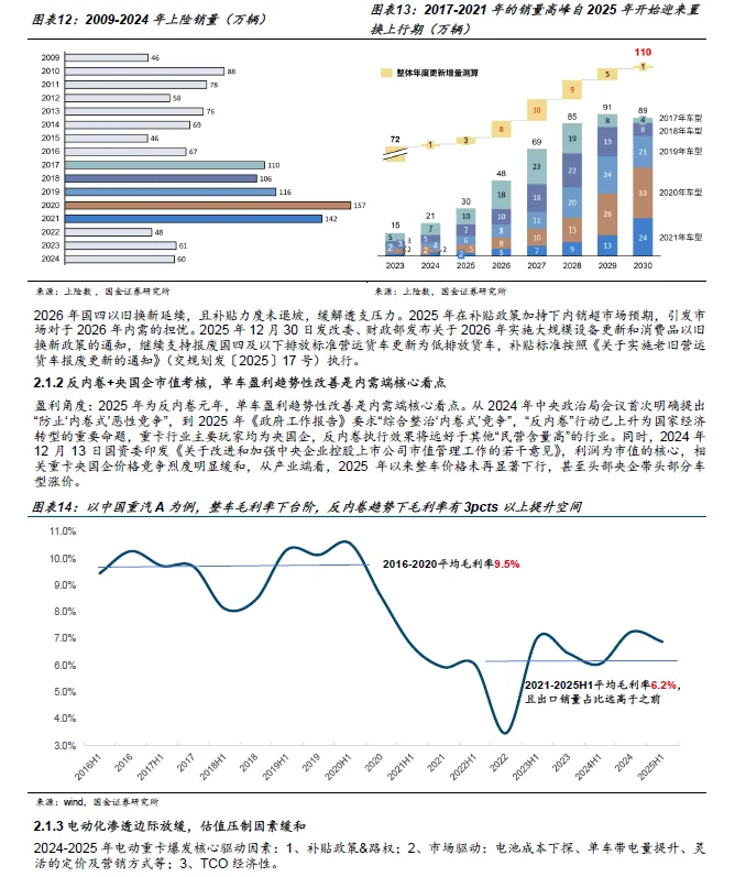 2、 结构判断:反 内卷与央国企市值管理驱动 内需 盈利修复 。 2 025 年起 反内卷 从政策表态走向执行,重卡行业作为央国企占主导的典型行业,价格竞争烈度明显缓和。 2026 年 开始的 单车盈利边际改善,将成为区别于过往 只看销量 的核心变量。