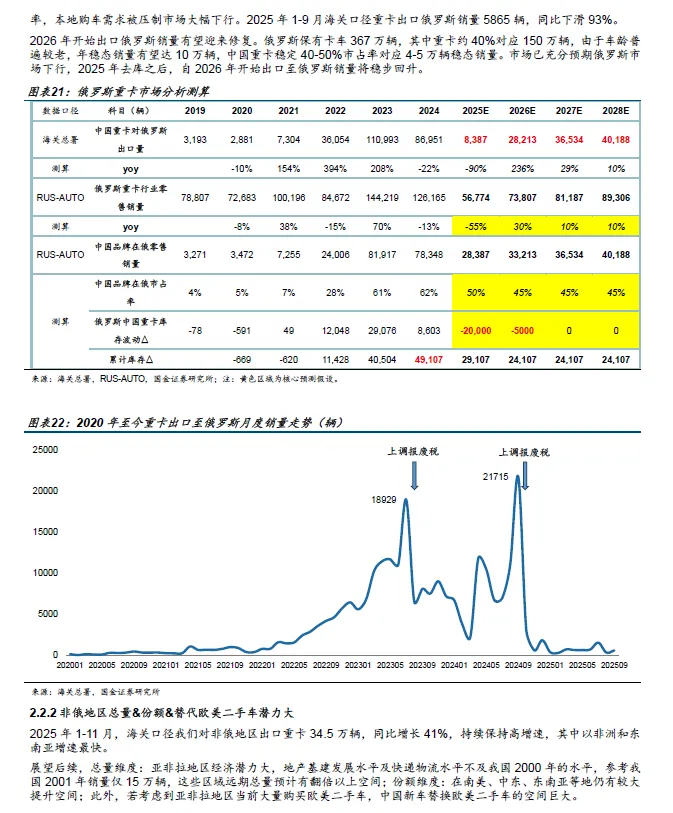 1、 总量判断:内需有 韧性 、外需有 空间。 内需 方面,国五更新周期自 2025 年起逐步启动,叠加国四及以下以旧换新政策延续, 2026 年内需具备韧性;出口方面,亚非拉市场仍处于 市场扩容 提份额 阶段,俄罗斯市场在去库存完成后有望修复, 非俄地区 市场容量 份额 替代欧美二手车潜力大,总量稳增无忧。