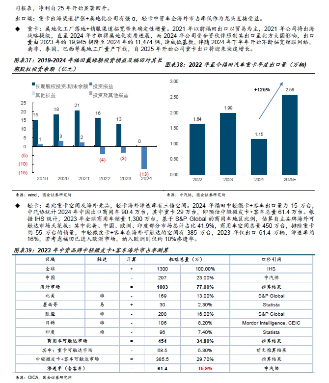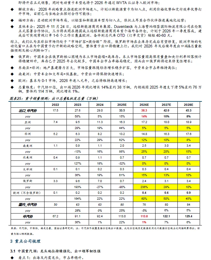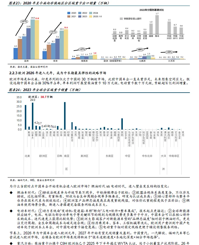 3、 出海判断:欧洲成为中长期最具弹性的战略市场 。 202 6 年为中国车企进入欧洲元年, 燃油时代中国重卡难以进入欧洲,而在电动化时代,动力系统技术路径与成本结构发生变化,中国车企在电池、电驱与整车集成上的比较优势开始显现, 欧洲市场的 意义不在于短期销量,而在于单车盈利和品牌跃迁空间。