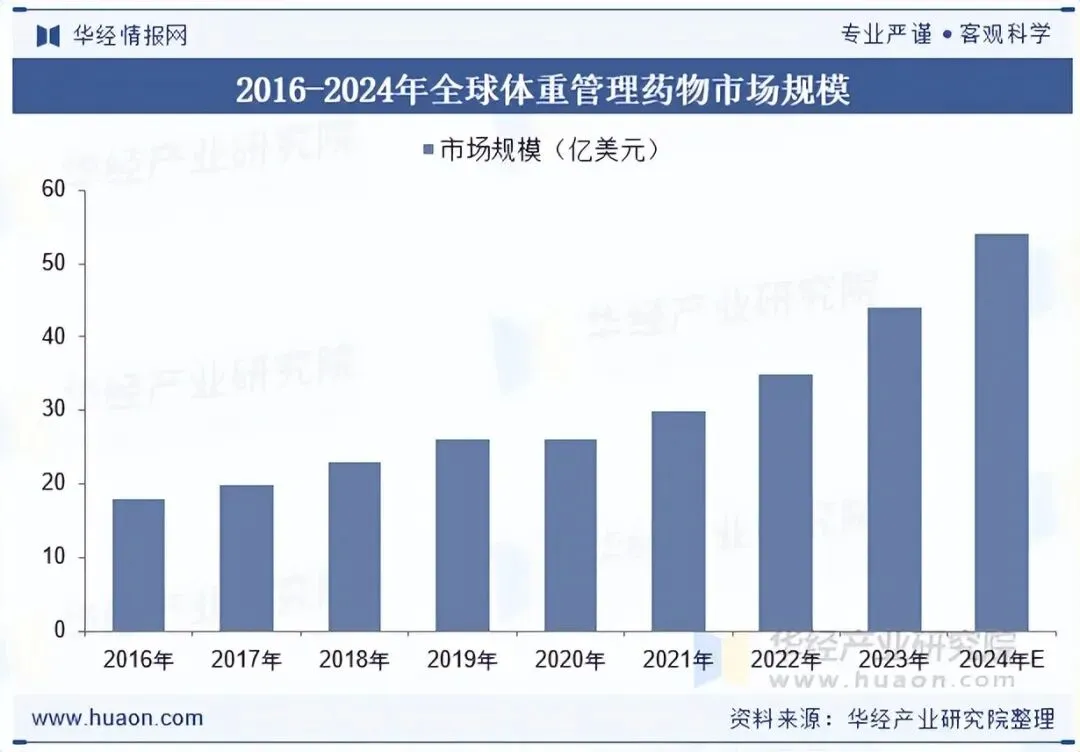 体重管理是一个复杂的健康管理过程,涉及能量调控、代谢调节、生理机制、行为干预及心理因素等多方面。因此,科学、有效的体重管理显得尤为迫切。国家也在陆续出台多项体重管理和肥胖防治政策,旨在通过提供专业指导、提升全民意识和技能、倡导健康生活方式,推动体重管理和肥胖防治工作科学化、规范化。全球体重管理药物市场展现出显著增长趋势,预计2024年全球体重管理药物市场规模为54亿美元左右。