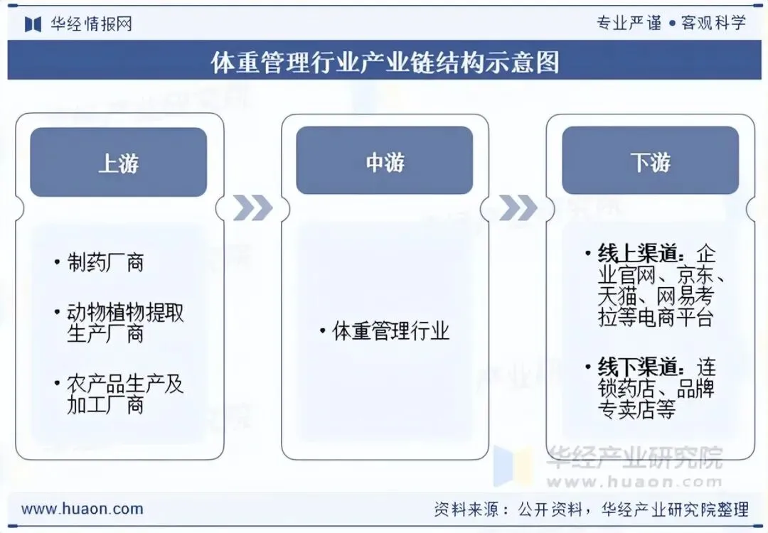 体重管理产业链由上游原材料供应、中游产品制造与品牌运营、下游销售渠道及终端消费者构成,形成完整的价值传递链条。上游参与主体为供应商,包含制药厂商、动物植物提取生产厂商、农产品生产及加工厂商。体重管理行业为高附加值行业,其产品种类数量众多,对原材料需求多样,包含植物类、农产品、益生菌类、中药材等多种类型,单一原材料的价格波动对行业整体利润影响较小,因此体重管理产品行业对上游行业依赖性小。下游参与者为渠道商,包含线上渠道与线下渠道,线上渠道有企业官网渠道以及京东、天猫、网易考拉等电商平台,线下渠道有连锁药店、品牌专卖店等实体门店。