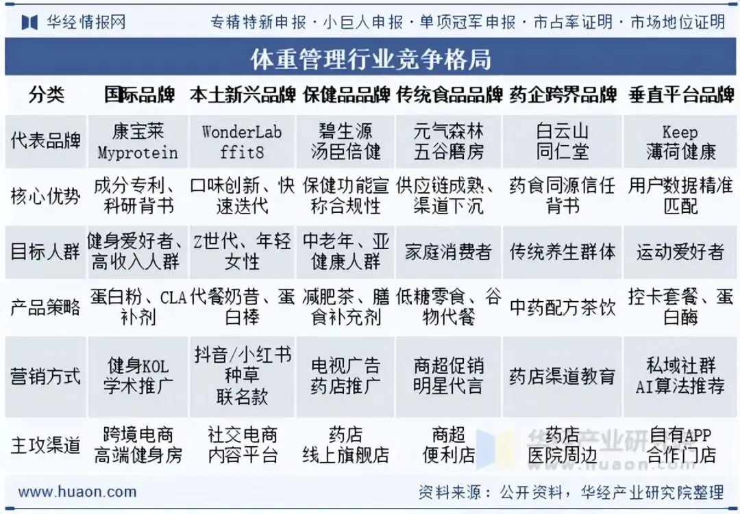 目前,中国体重管理市场涵盖了国际品牌、本土新兴品牌、保健品品牌、传统食品品牌、药企跨界品牌以及垂直平台品牌六大类。各企业依据自身竞争优势精准定位,在产品、营销以及渠道等方面各展所长,以满足消费者的不同需求。