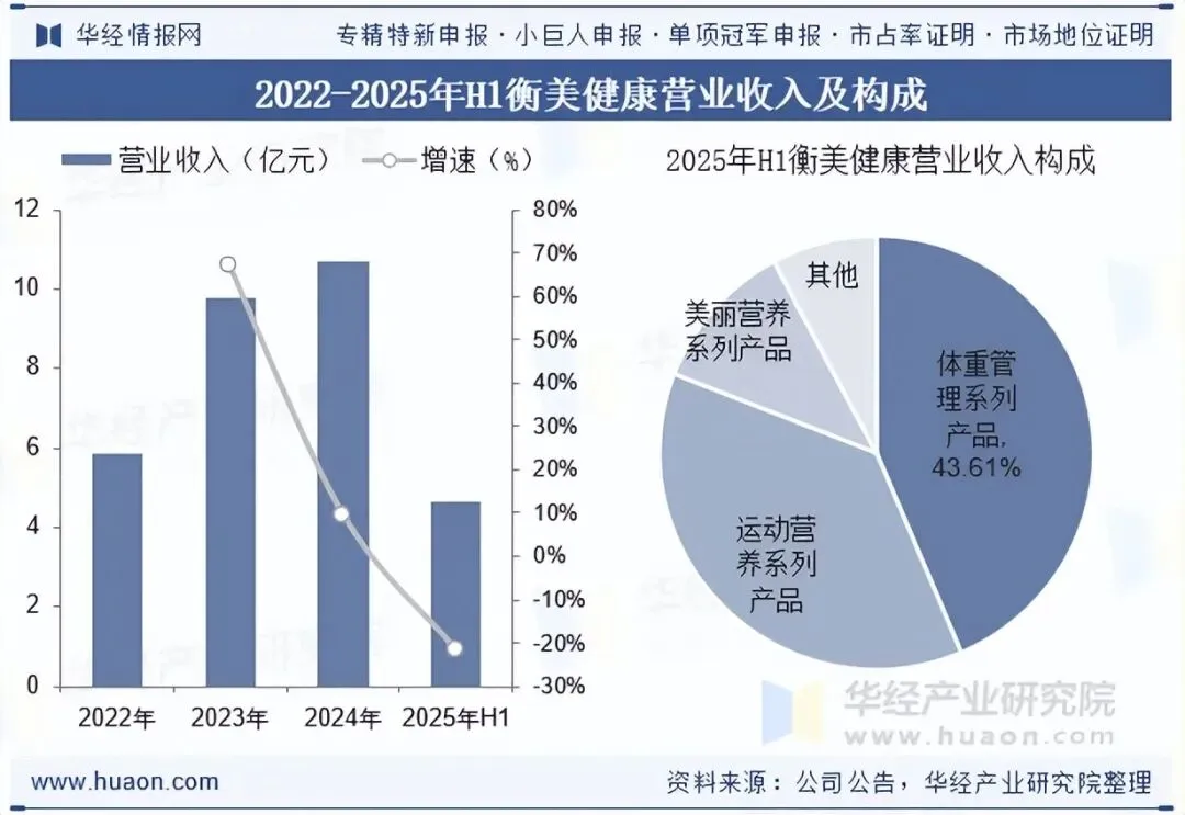 浙江衡美健康科技股份有限公司是一家专业从事营养功能食品研发、生产和销售的高新技术企业,自成立以来,公司始终践行“以健康理念定义未来食品”的发展使命,形成了独具特色的蛋白产业化系列产品布局,积累了超过5000款个性化产品配方,覆盖体重管理、运动营养、美丽营养等主流细分市场,并拓展至健康零食、肠道健康、身体营养、基础营养等新领域。营收方面,2025年上半年公司营收4.65亿元,其中体重管理系列产品2.03亿,占总营收比重的43.61%。