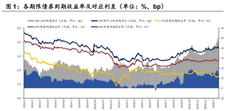 2025年规上工企利润增速提升,12月单月盈利改善,库存去化加快、产销适配度提升,经营压力或边际缓解,企业盈利修复态势初显。但是,营收与利润率表现仍呈分化,盈利质量受一定制约,行业间也表现分化,中上游较好而下游承压。“反内卷”措施或有一定效果,但利润修复的持续性还需观察政策能否激发终端需求改善、拉动物价企稳回升。数据公布当日,10年期、30年期国债活跃券收益率分别上行0.7BP、1.75BP至1.832%、2.258%,债市对基本面的反应或仍呈“对利多钝化、对利空敏感”的特征,经济基本面的结构性亮点可能会制约利率下行空间,我们维持近期长债震荡的观点。