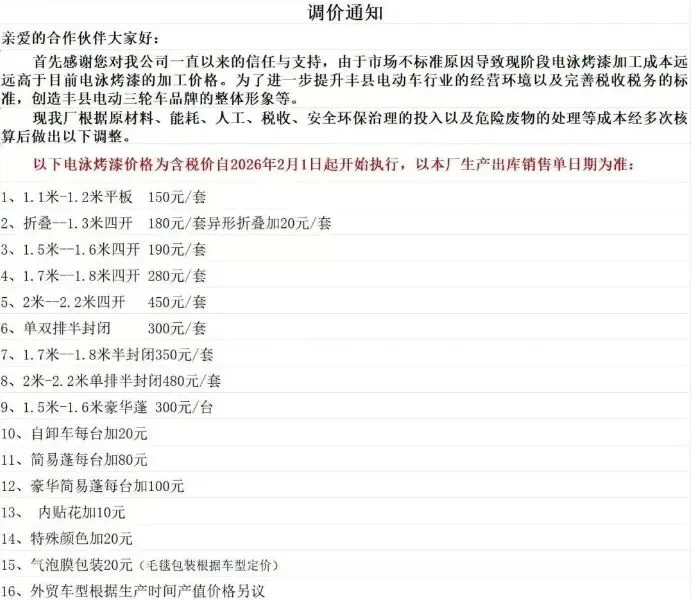 刚从电机、电池轮番涨价的压力中稍作喘息,丰县电动三轮车行业再迎重磅利空——电泳烤漆环节官宣集体涨价,涨幅覆盖150元/套至450元/套,新规将于2月1日正式落地,持续攀升的成本压力,已然成为压垮行业的关键稻草。