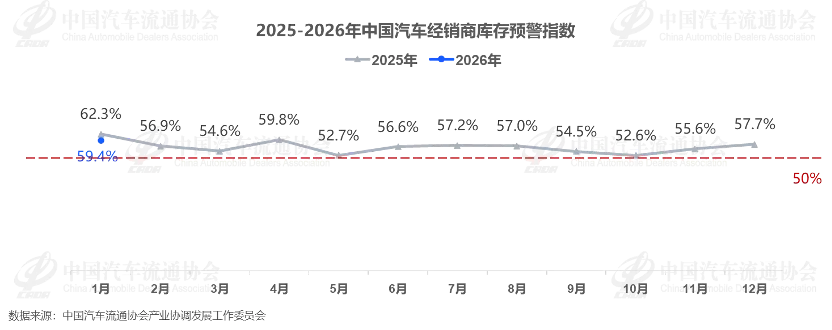 2026年1月31日,中国汽车流通协会发布的最新一期“中国汽车经销商库存预警指数调查”VIA(Vehicle Inventory Alert Index)显示,2026年1月中国汽车经销商库存预警指数为59.4%,同比下降2.9个百分点,环比上升1.7个百分点,库存预警指数位于荣枯线之上。