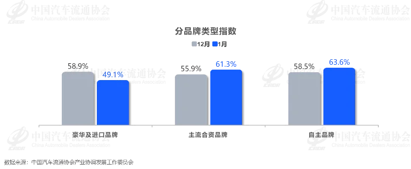 从分品牌类型指数看:1月豪华及进口品牌指数环比下降,主流合资、自主品牌指数环比上升。