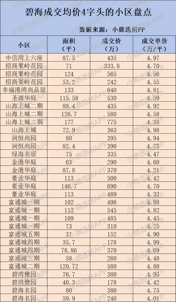 我们盘点了2025年碧海成交单价跌至4字头的小区,且按照成交均价从低到高依次排列。