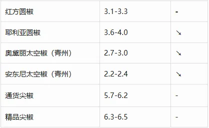尖椒行情今日价格5.7-6.4元,疲!青州太空椒今日行情2.7-3.0元左右,行情下滑,质量参差不齐。今日龍椒参考5.5-6.5元,一般质量与精品价格差距较大,质量差距大。本地红彩椒5.2-5.8元,黄彩椒价格5.2-5.6元。西红柿毛粉/硬粉参考价2.8-4.6元左右。