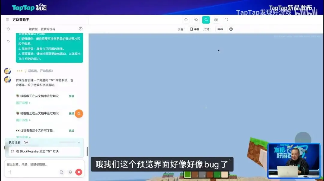 很有意思的是,Dash毫不避讳所谓的「翻车」,「TapTap制造」在直播过程中也屡次出现Bug,比方说预览界面无法正常显示、新制作的炸弹没有消失、所制作的音效无法正常播放等等,但这种糙反而更显得真实,而整体来看,这款产品的确展示出了不错的潜力。