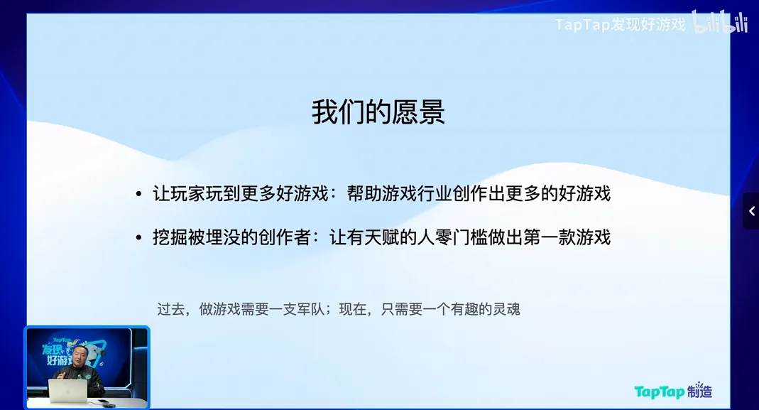 我们今天不只是帮助玩家发现好游戏,还要帮助玩家玩到更多的好游戏,通过帮助游戏行业创作更多的好游戏来实现这个目标,同时还希望能够挖掘更多被埋没的创作者,让有游戏天赋的人零门槛地做出他的第一款游戏。
