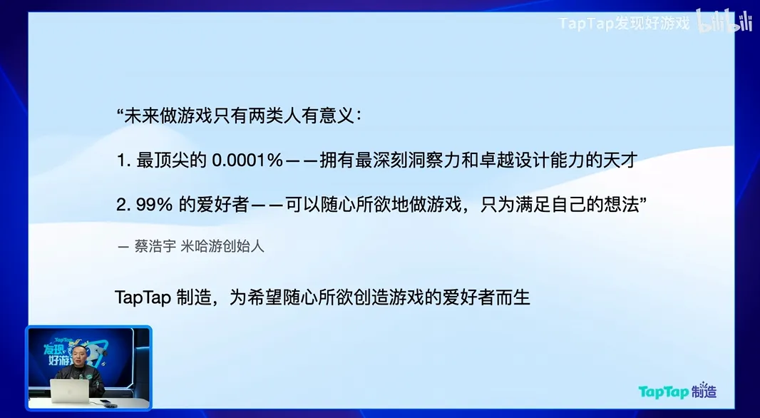 同样的想法,我现在也想引用一下蔡浩宇的一句话,他说:未来做游戏可能只有两类人,其中有最顶尖的0.0001%那部分人,他们有最深刻的洞察力,最卓越的设计能力去做最顶尖的游戏,剩下99%的爱好者,可以随心所欲地做游戏,只为满足自己的想法。