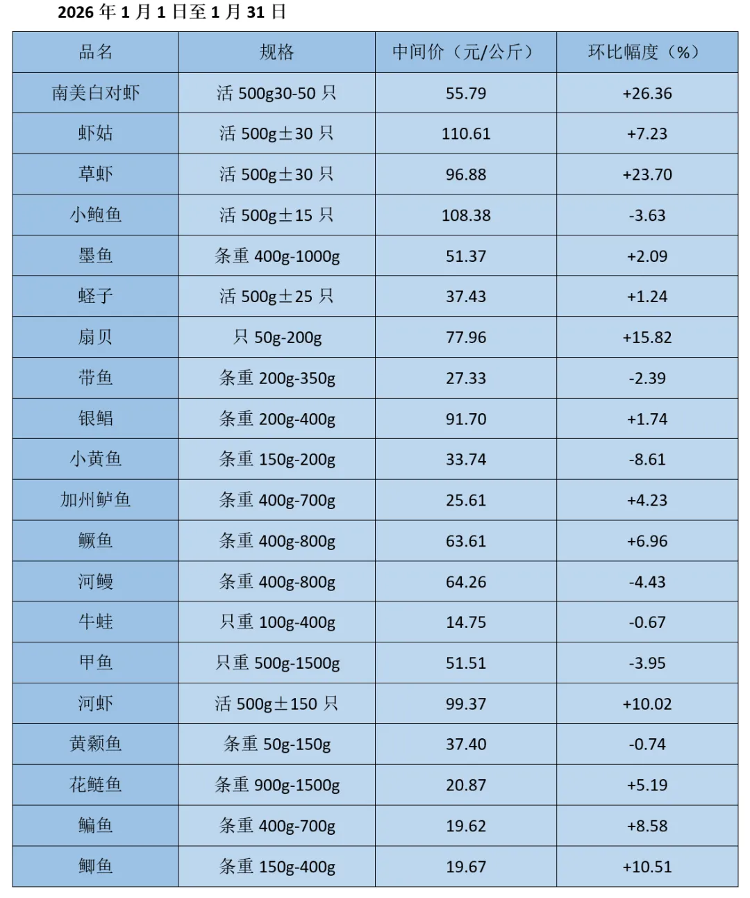 淡水鱼类各品种市场交易情况:本期淡水鱼多数品种市场交易价格有所下跌。淡水“四大家鱼”各品种市场交易价格上涨明显,其中鲫鱼市场交易价格涨幅最大。淡水“名、特、优”鱼类多数品种市场交易逐步上涨,其中笋壳鱼货源减少则涨幅较大。淡水常规鱼类各品种市场交易价格则有不同程度的下跌。本期“四大家鱼”交易量为828吨,环比上月上升6.70%、同比去年下降7.07%。交易额为1533万元,环比上月增加15.18%、同比去年增加8.96%。综合均价每公斤18.52元,环比上月上涨7.99%、同比去年上涨17.29%。海水冰鲜鱼类各品种市场交易价格涨跌互现,随着海鳗的“登场时刻”,产地东海的海鳗入市进一步拉高了其交易价格。海水鲜活鱼类市场交易价格有涨有跌。