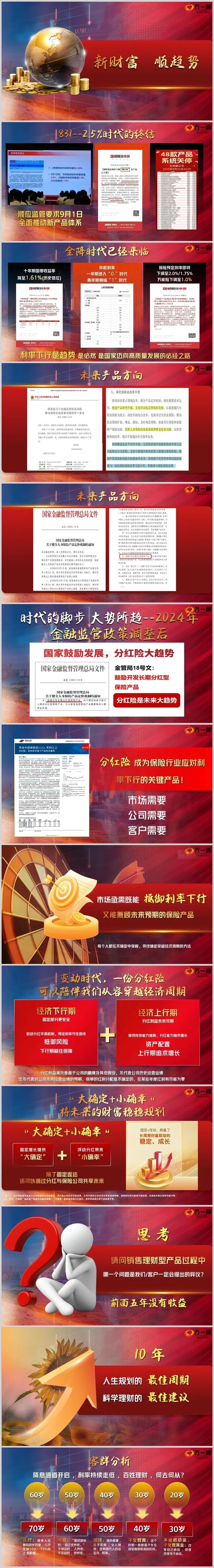 40 - 50 岁的客户群体则更加关注财富的稳健增长和养老规划。这个时期,他们可能已经积累了一定的财富,但面对利率下行的市场环境,他们需要寻找一种能够稳定保值增值的理财工具。分红险的 “下有保底,上无封顶” 的特点正好满足了他们的需求。固定的收益部分为他们的财富提供了稳定的底线,而分红部分则为他们的财富增长提供了无限的可能性。通过购买分红险,他们可以在享受稳定收益的同时,分享保险公司的投资成果,实现财富的稳健增长。