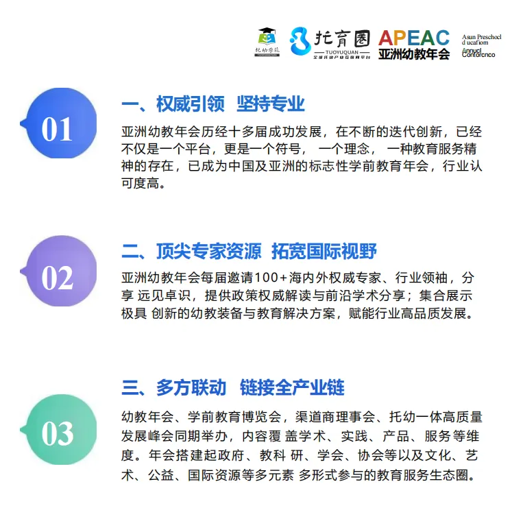 APEAC展、会并重,荟聚国内外一流教育资源和创新要素,和产业端建⽴了⾮常紧密的链接,链接起⼤量优秀的产业资源。我们围绕“引进来”和“走出去”,服务形式从国际论坛、展览展示扩展到名园行、工厂行、产区行,举办城市从固定到巡回,为海内外学前教育装备和幼教用品的研发、生产制造、销售企业搭建起深入开拓中国乃至国际市场的供需面对面沟通平台。同时,形成一个强大传播影响力的知识传承与创新、研讨与交流的学前教育内容平台,广受赞誉。