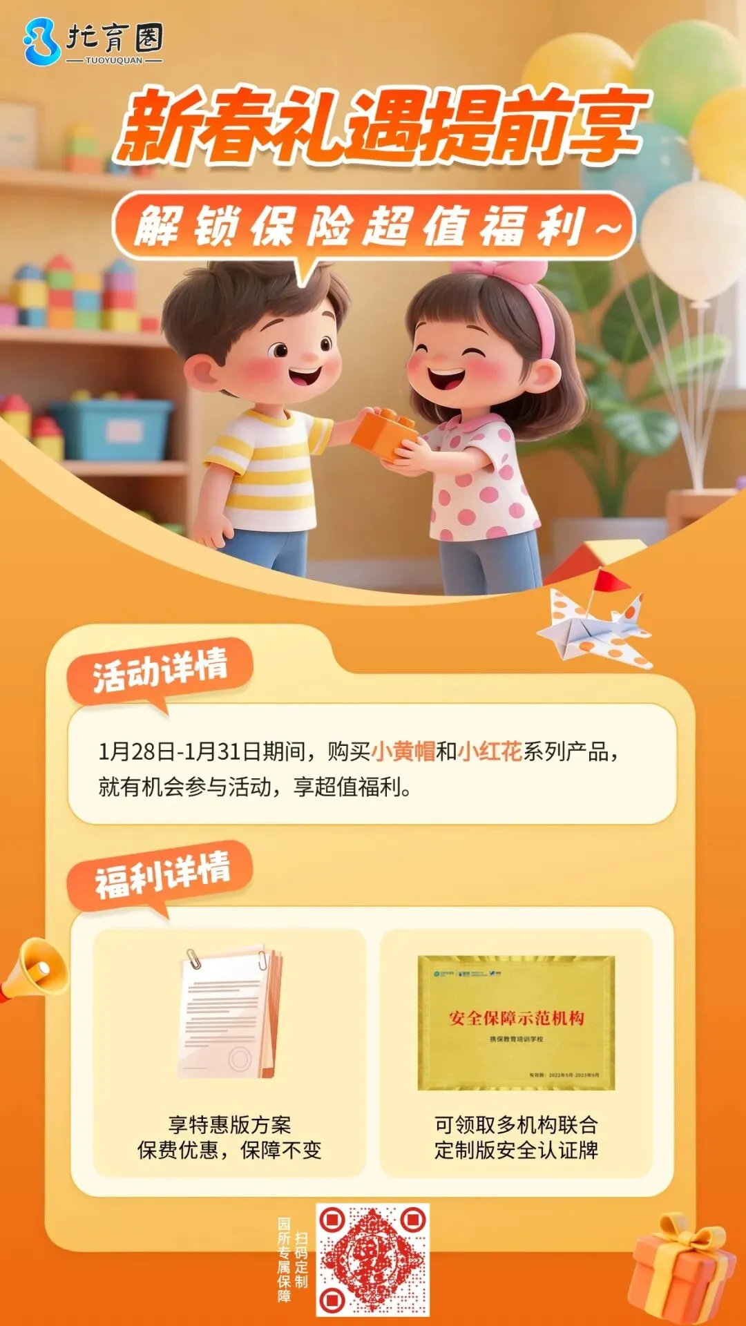 【园所必备】安全保障到位,园所经营无忧,不仅能保障托幼机构、孩子和家长的权益,降低机构经营风险还能提升家长的满意度,建立良好的家校关系,托育圈粉丝会员新春投保享特别优惠,赠送安全认证铜牌,马上申请!