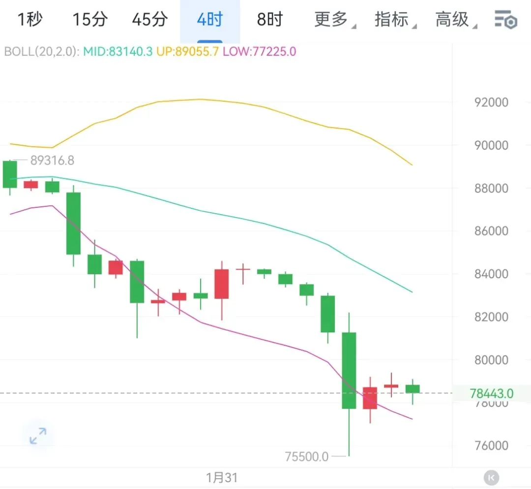 四小时图上,价格在触及近期低点后暂时企稳,目前围绕78400一线持续震荡整理。从技术形态来看,布林带三轨同步下行,价格整体承压于中轨下方,显示下行通道依然完整;MACD指标仍处于死叉状态,空头动能尚未出现明显衰竭。当前的震荡反弹缺乏量能支撑,更多属于连续下跌后的技术性修复,而非趋势逆转信号。