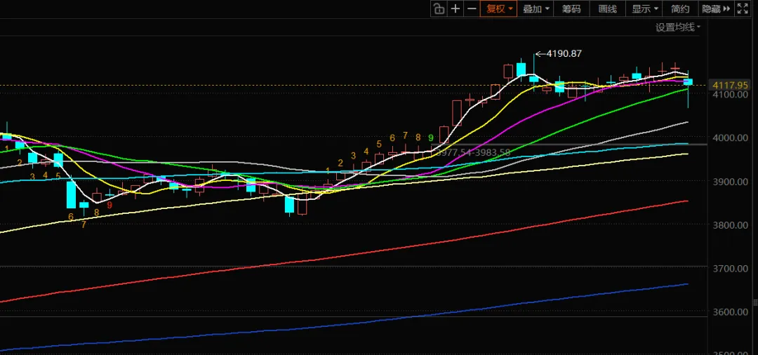 周五沪指4131.99点小幅低开,开盘后分时略作上冲,沪指最高4152.85点,随后沪指分时震荡走低,10点10分后沪指分时加速下跌,分时跌破4110点4098点4086点4072点,沪指分时最低4064.78点止跌,沪指分时快速收回4072点4086点,分时在4098点位置震荡,中午收盘沪指站上4100点收盘。下午开盘沪指继续盘升,分时收上4110点,沪指来到4025点震荡,临近下午尾盘沪指分时选择在4125点之下横盘,最终沪指收4117.95点,沪指日线收长下影线小阴线,周线收长下影线小阴线,月线收突破阳线。两市成交28355亿元,量能缩量走势。周五走势看沪指15分钟线杀出C浪走势,按照标准C浪走势沪指应该C浪完成对称走势的点位在4080.29+4170.21-4190.87=4059.63点,周五沪指最低4064.78点,差5个点完成C浪对称,从走势上看应该是完成C浪对称下跌,但由于日线收出长下影线小阴线,日线虽然守住21日均线,但预计周一沪指分时还有下探看下方支撑力度。在15分钟线上C浪用时太短就完成,所以需要震荡消化一下。但这个消化时间也不会太长,预计最多周一消化指数一天,但周一应该是中小股票上涨,分时黄线在上,分时白线调整一天。周五杀指数是超出预期的,既然杀指数了,完成C浪下杀,说明指数做空动能快速释放,下周进入2月,2月4日是立春,指数进入春季行情,好好把握个股行情。有色周五晚间大跌,周一A股有色黄金会有杀跌,其实这对科技板块是好的,资金又流向科技。临近春节指数引燃向上看4200点。所以不要因为指数涨跌影响你持股心情。年报预期增长股是可以关注,炒预期炒业绩尤其是科技股的业绩增长是可以关注的。二月继续看4200点,沪指周一支撑4034点4059点4072点4098点4110点。压力4140点4150点4190点4200点。二月四号立春是真正春季行情的开始。
