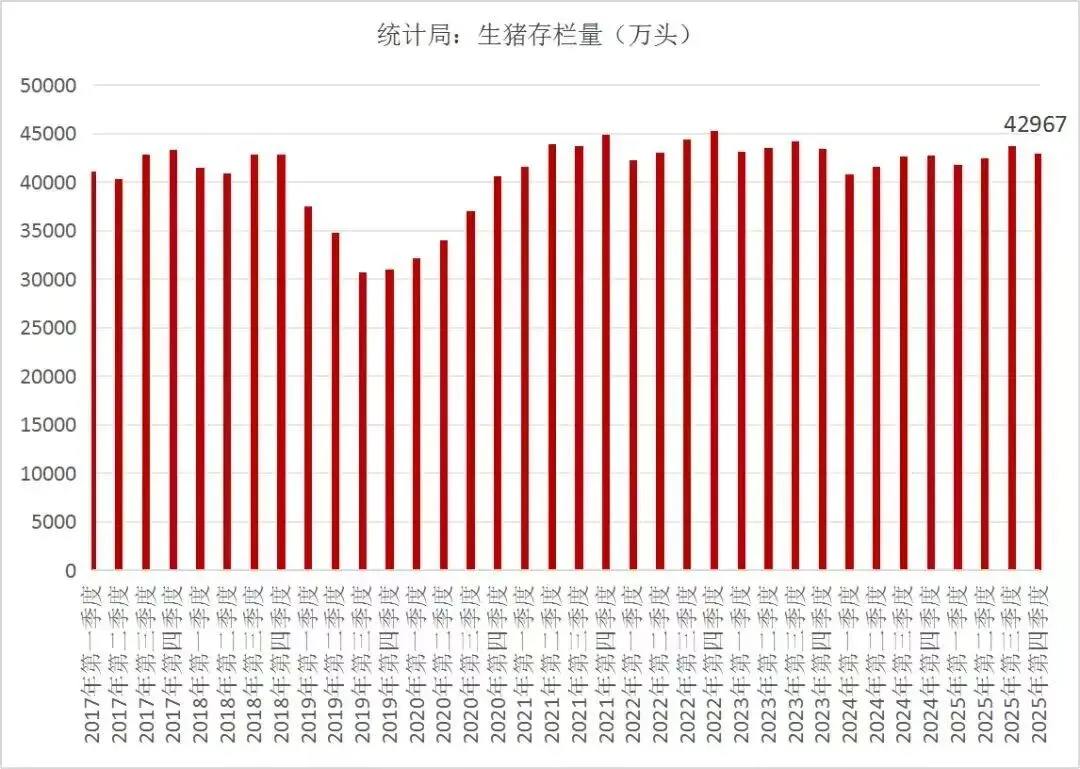 根据国家统计局2026年1月最新数据,2025年末全国能繁母猪存栏量降至3961万头,同比下降2.9%,这是时隔17个月,能繁母猪存栏量重回4000万头以下,而且已经逼近农业农村部设定的3900万头合理保有量红线。