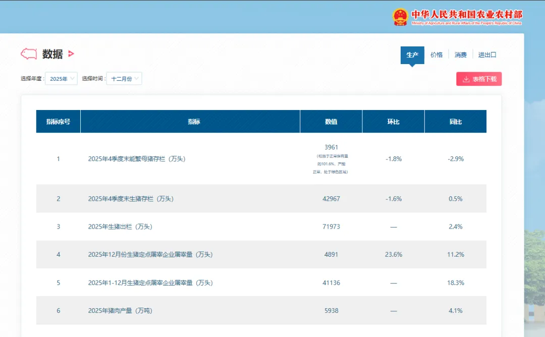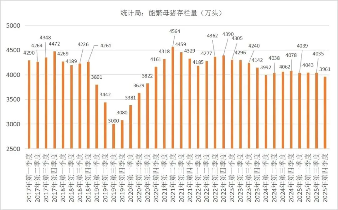 根据国家统计局20261月最新数据,2025年末全国能繁母猪存栏量降至3961万头,同比下降2.9%,这是时隔17个月,能繁母猪存栏量重回4000万头以下,而且已经逼近农业农村部设定的3900万头合理保有量红线。