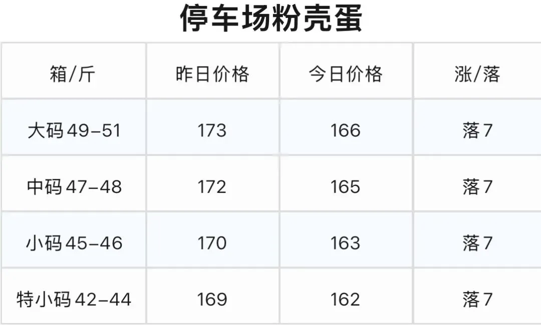 1. 停车场粉壳蛋:所有规格(大码/中码/小码/特小码)今日价格较昨日统一下跌7元/箱