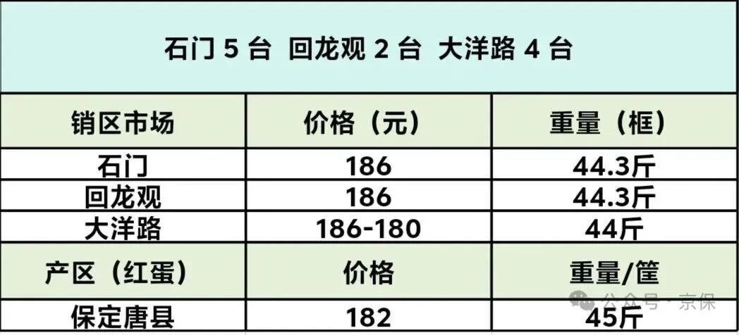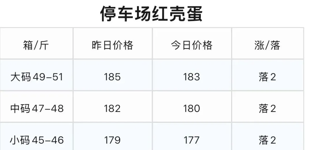 2. 停车场红壳蛋:所有规格(大码/中码/小码)今日价格较昨日统一下跌2元/箱。