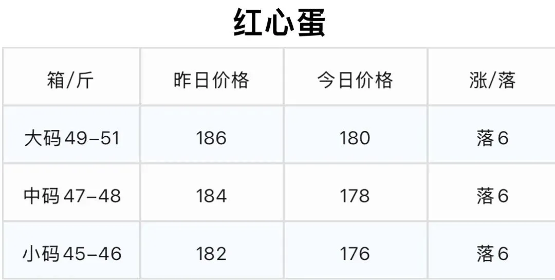 1. 停车场粉壳蛋:所有规格(大码/中码/小码/特小码)今日价格较昨日统一下跌7元/箱