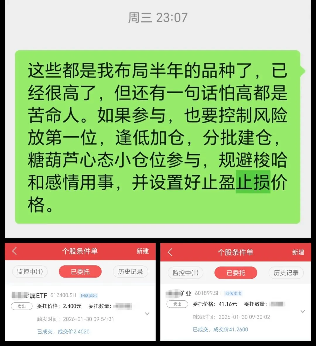 追高买入追趋势要及时设置止损线,这是我经常强调的风险措施,不是等到行情来了不知道如何应对,而是在行情极致演绎期就准备好如何撤退。这点我本周在社群里面多次提醒:有色虽好,但不要追高,逢低布局,做好止损。也因为提前布局好的逢高回落卖出止盈线避免损失进一步扩大。