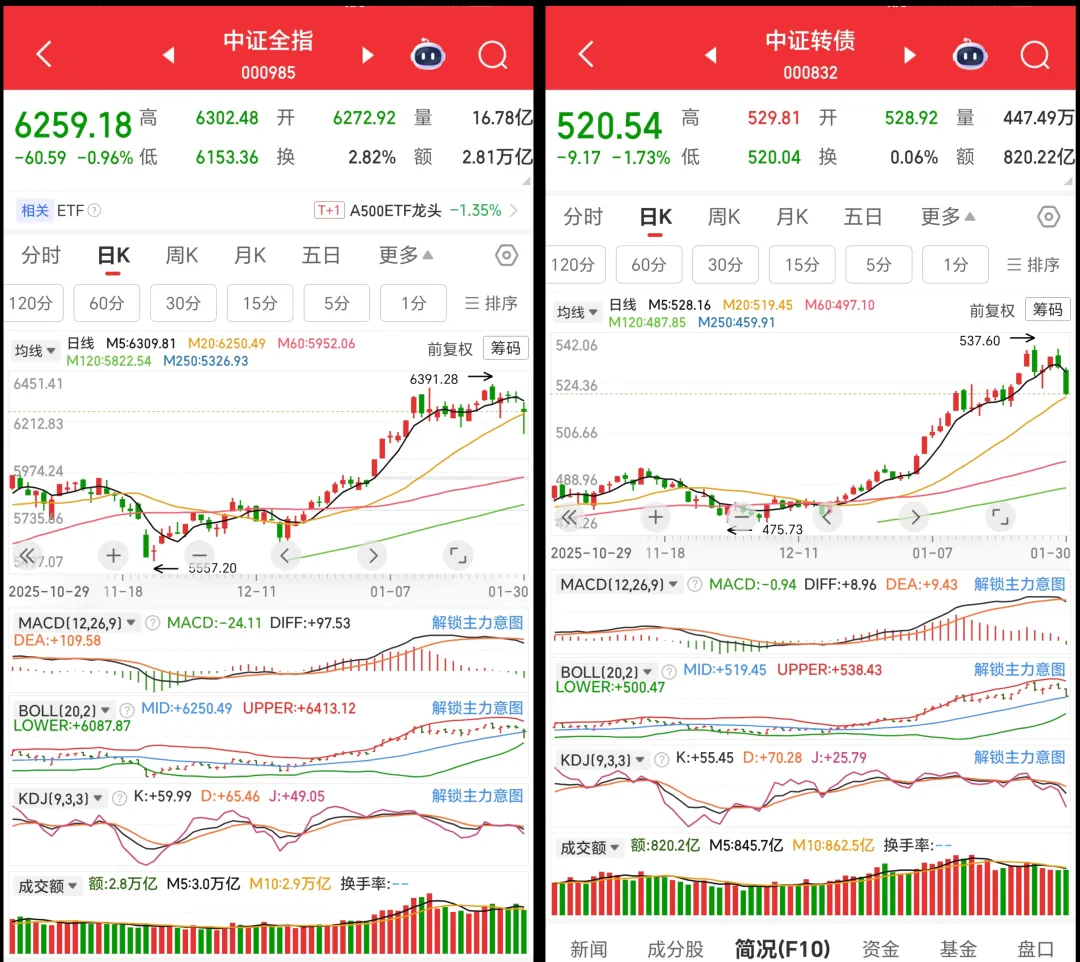中证转债同样在创出阶段高点537.60后回调,当日跌幅达1.73%,调整力度大于中证全指。指数仍在20日均线之上,但MACD已率先死叉,KDJ的J线快速回落至25附近,短期获利回吐压力明显。不过布林带中轨依然向上,成交量未出现异常放量,显示中期上升趋势的支撑仍在,此次调整更偏向技术性回踩。下周看布林带中轨是否能获得支撑,如跌破将降低转债量化仓位。