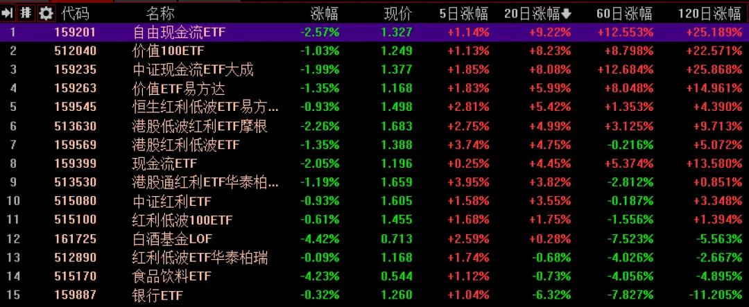 【5】红利/价值:红利板块,目前优选现金流、价值ETF或者港股红利低波。A股红利5日有所反弹,但仍远弱于港股反弹力度;