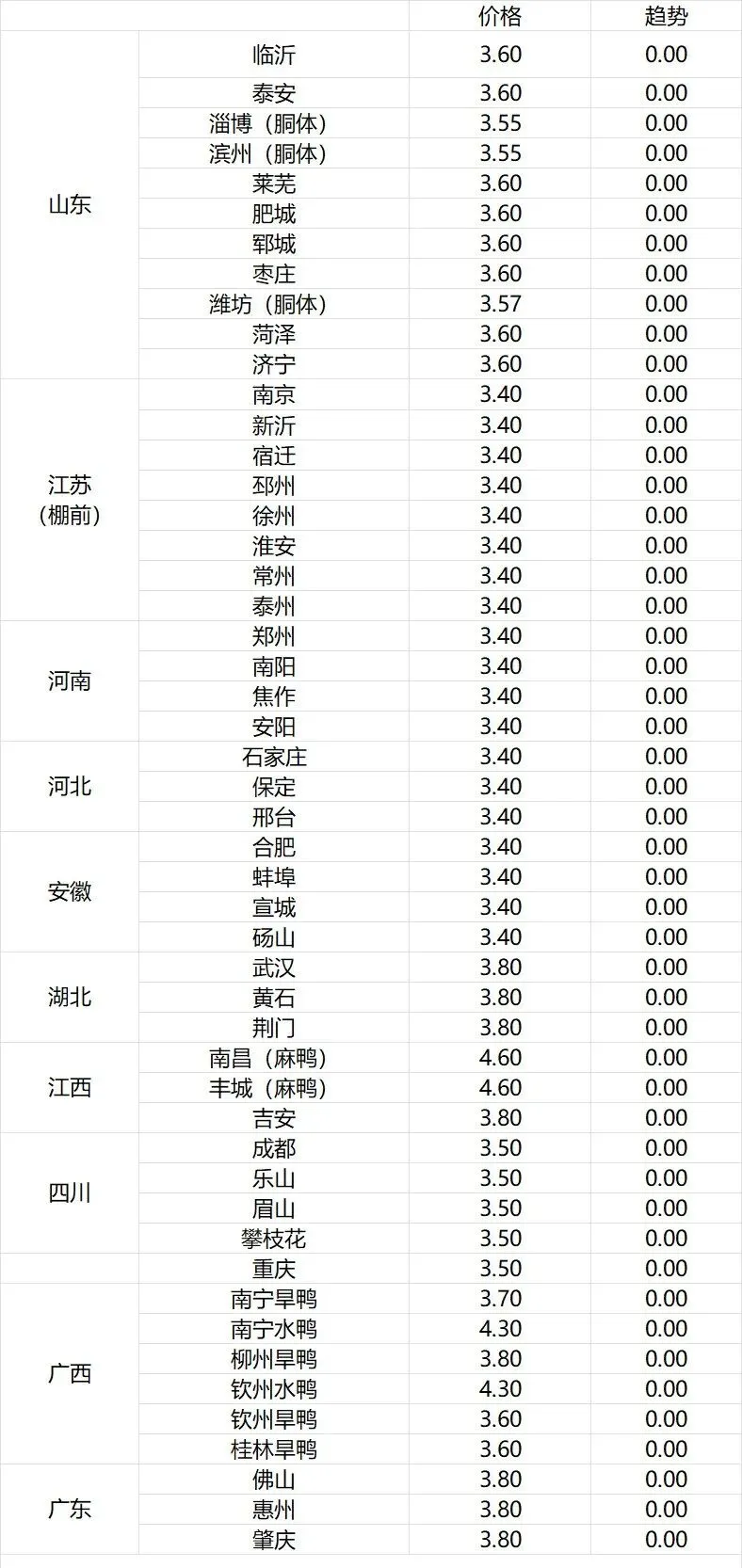 微评:鸭苗报价稳定。(注:南方只报当天价格)合同落的较快,补栏情绪逐步谨慎。根据产品、养殖成本及鸭苗现状分析,预计近期鸭苗价格呈稳中微调趋势。种蛋报价稳定。温馨提示:该价格为主流厂家报价,实际销售价格以成交价格为准,价格仅供参考。