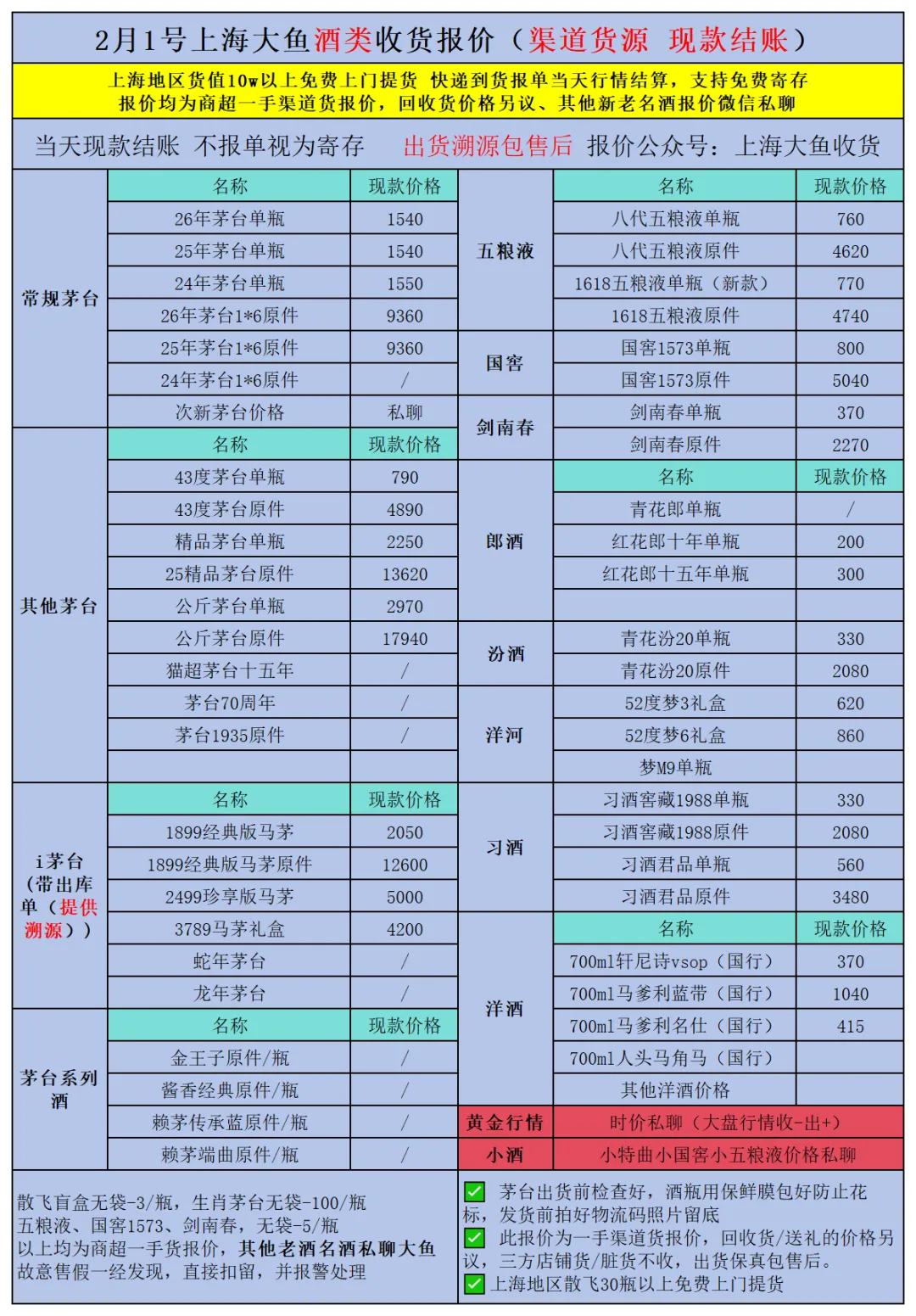 当前位置:首页>行情>2026年2月1号-上海酒类收货行情报价(现款结账,渠道货源)